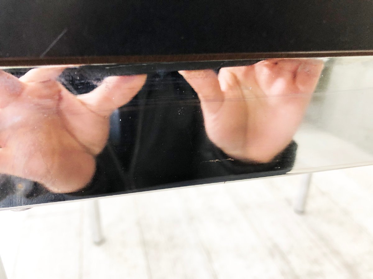 - 目立つ箇所あり傷・凹みが多数、深い傷・凹みが一部ある。(例、天板、幕板、棚板、サイド部分、脚部等にある。)