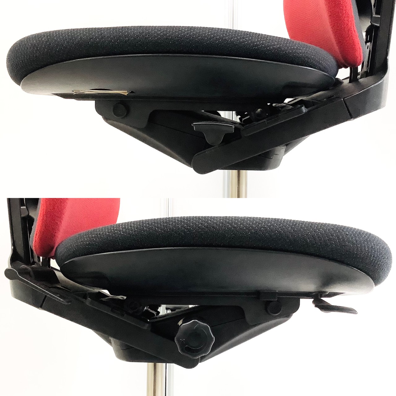 例えば、座面は、イトーキ独自の"ベンディングシート"という機構により、クッション、インターシェル、空洞という三層構造になっています。 この真ん中に挟まっているインナーシェルが、着座時の姿勢に合わせて体重を分散してくれるので、どんな姿勢でも体になじみ、疲労を軽減してくれます。 さらに、座面は前後に4センチほど奥行きを調整でき、前傾姿勢で座りたい、深く腰掛けたい、膝裏を圧迫されたくないなど、個人の好みに合った快適さにカスタマイズが可能となっています。