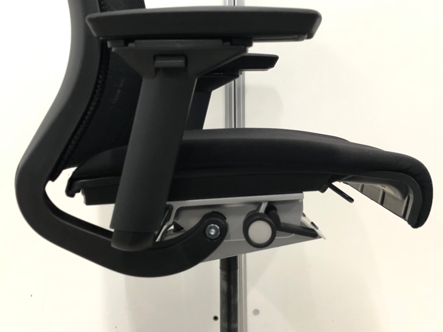 - レバーを引き上げながら座面を前後にスライドさせ、レバーを放すとロックします。背もたれに身体をつけた状態で膝の裏側と座面のエッジの間に5-8センチほどの隙間ができるのが理想的です。