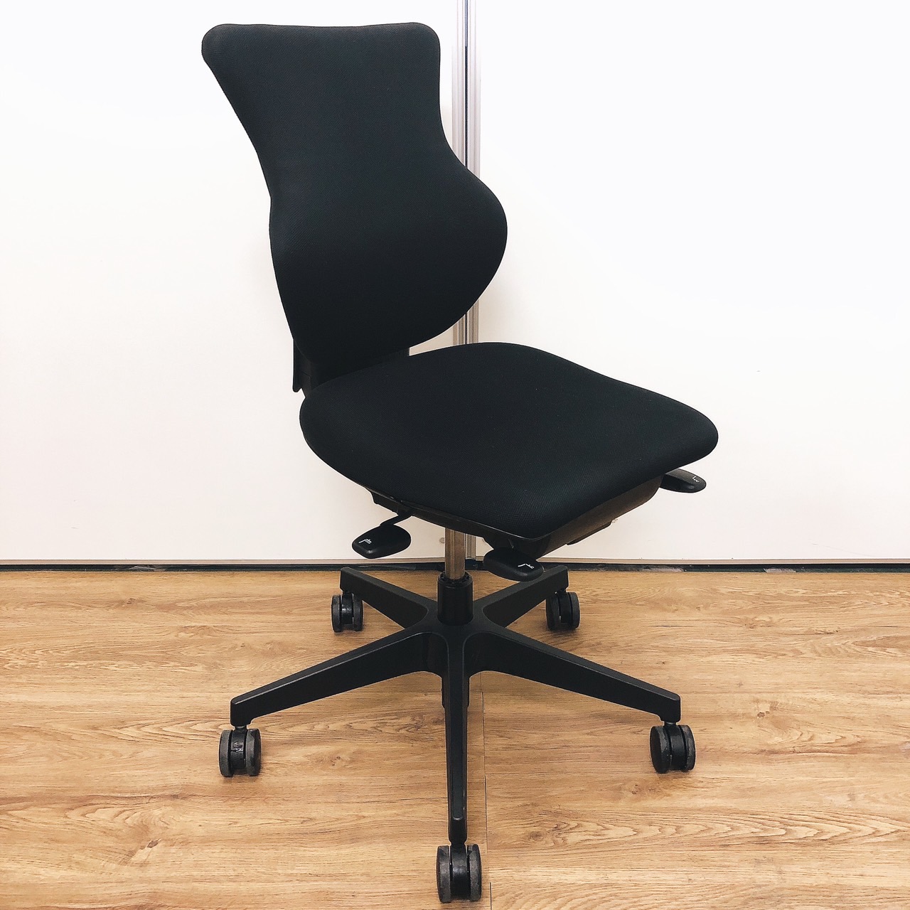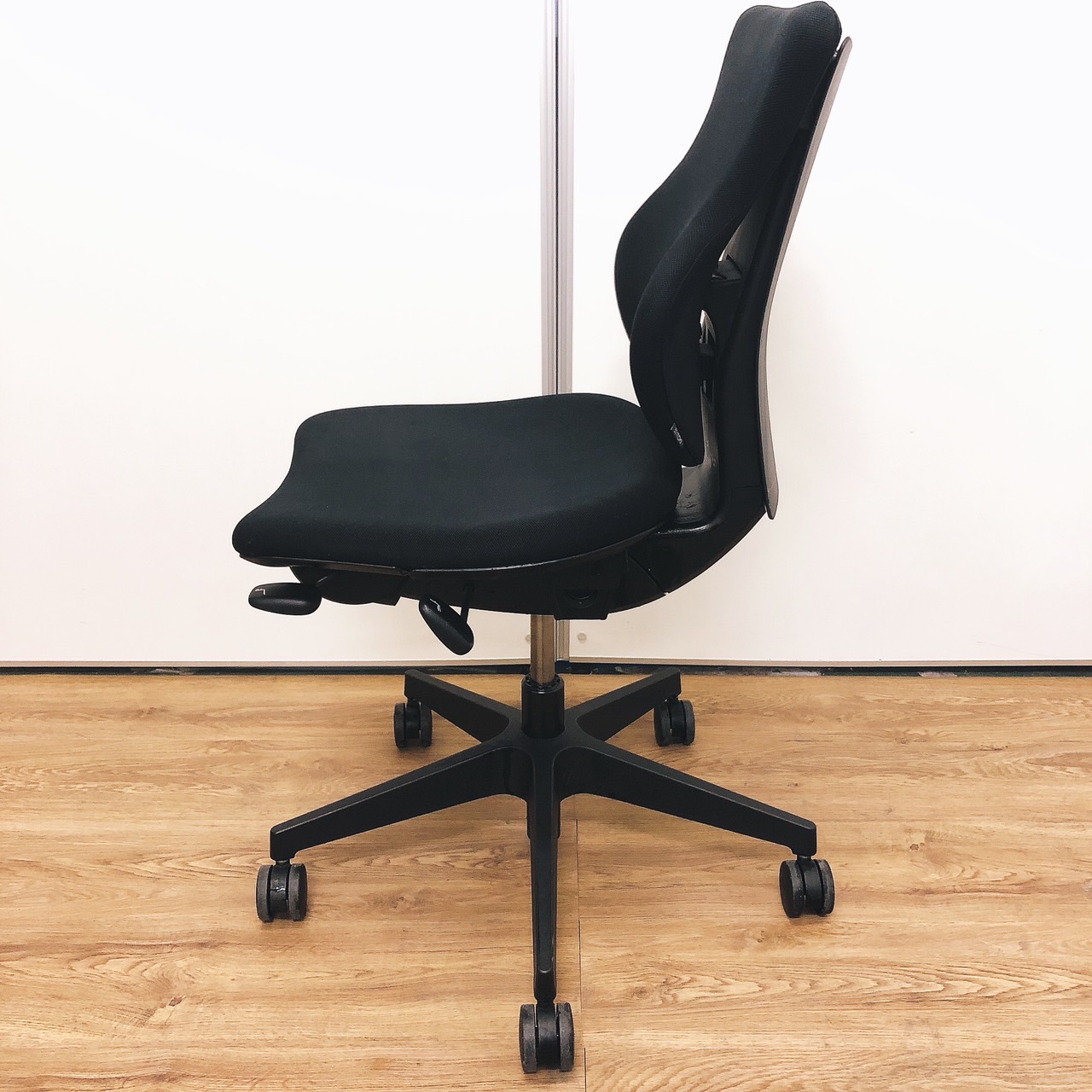 - 女性の作業姿勢に多く見られる2つの姿勢を、美しく支える背もたれ形状です。後傾しても背のラインを崩しません。