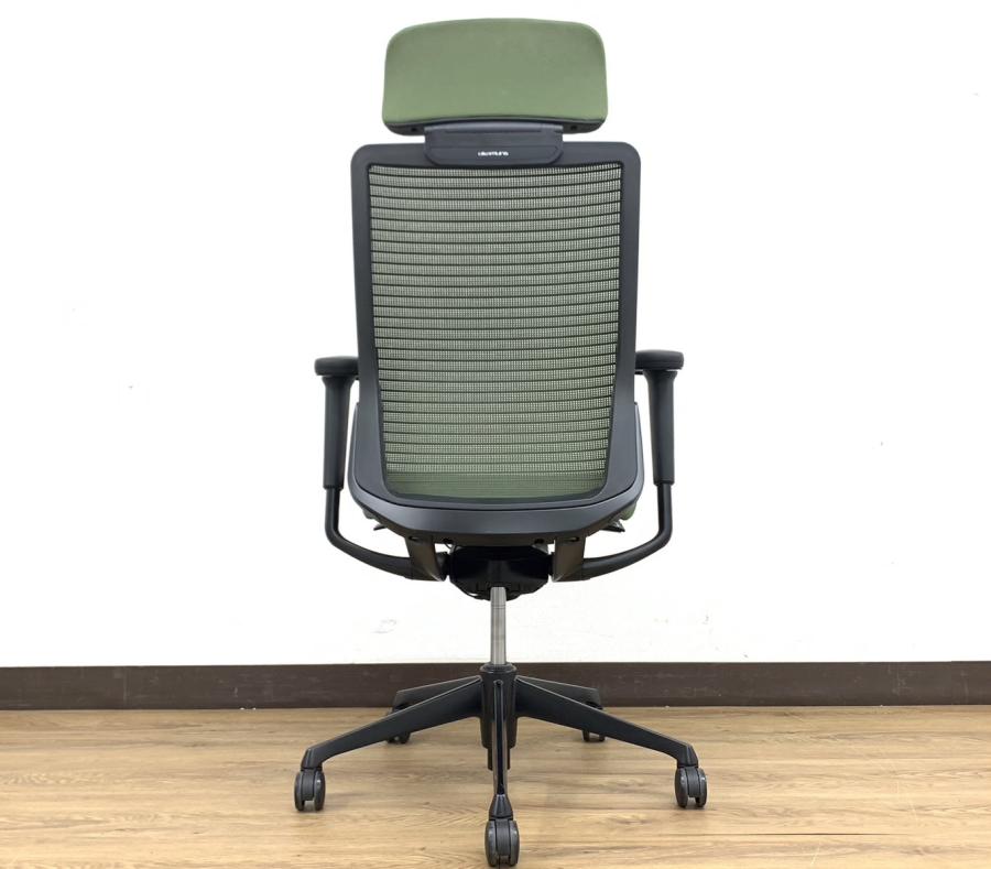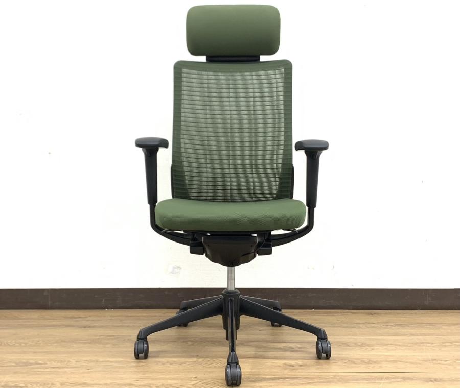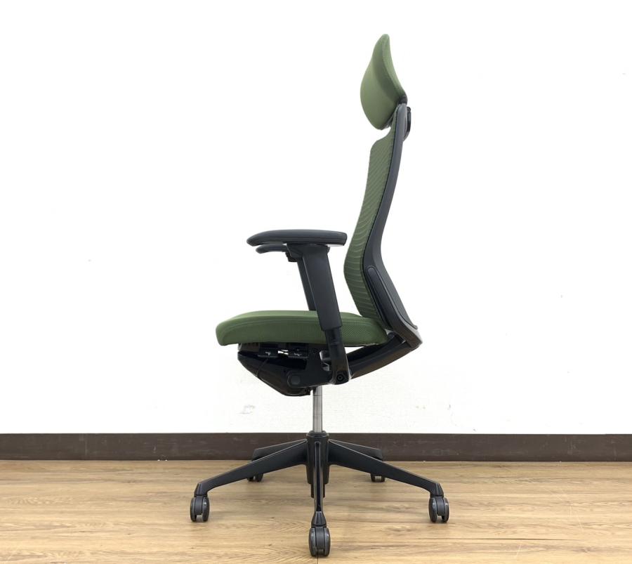 【上質で快適なメッシュチェア!】■オカムラ コーラルチェア ヘッドレスト付 可動肘タイプ ダークグリーン エクストラハイバック- 品川・三田店