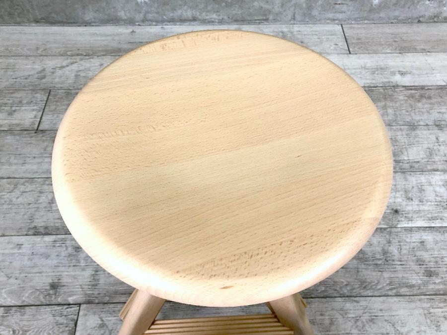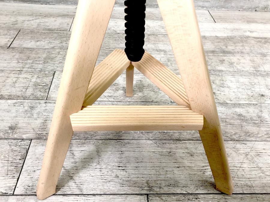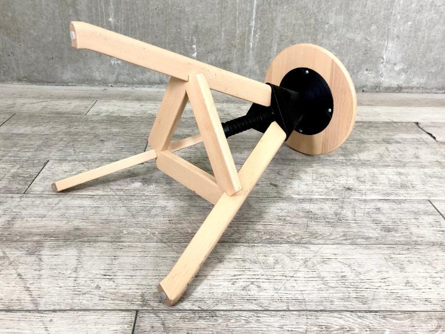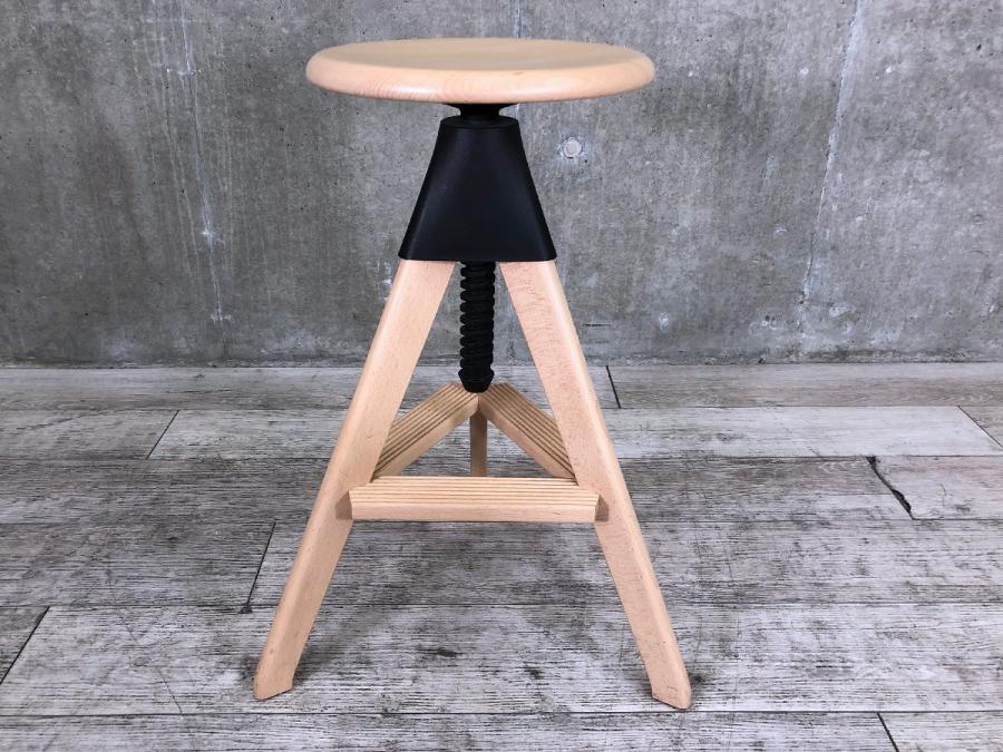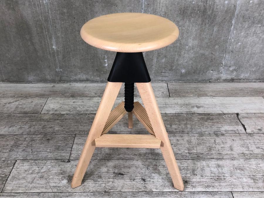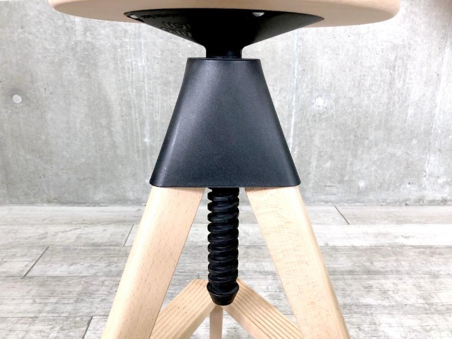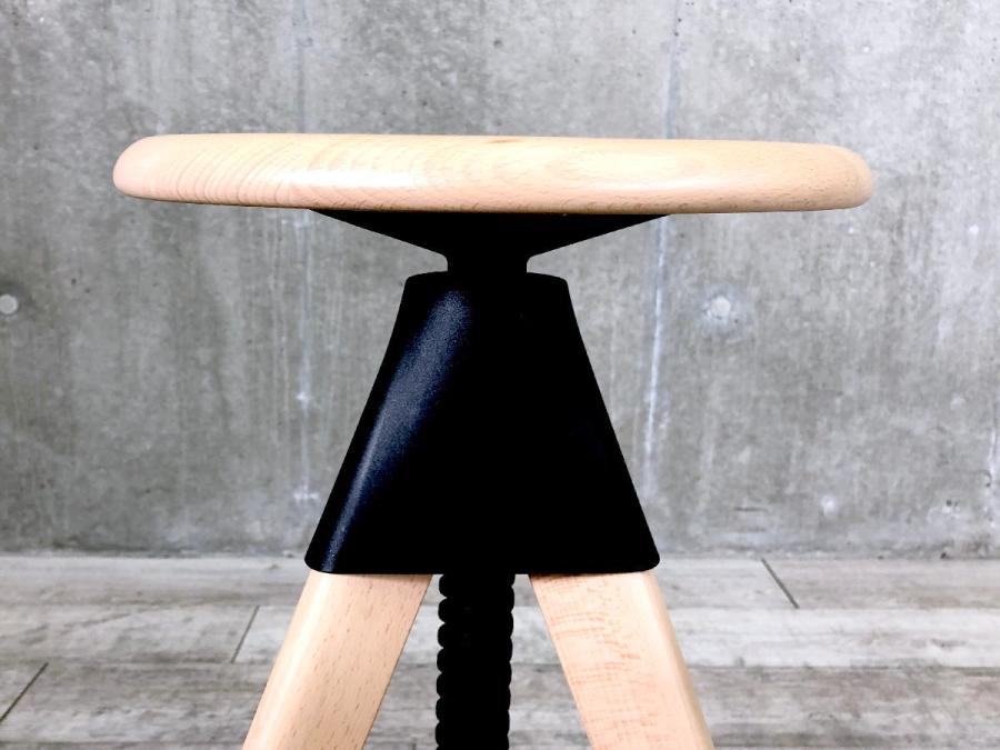 形は古典的な作業用スツールですが、機構部に使われた色鮮やかな樹脂と、木の質感との対比が斬新な印象を与えてくれます。