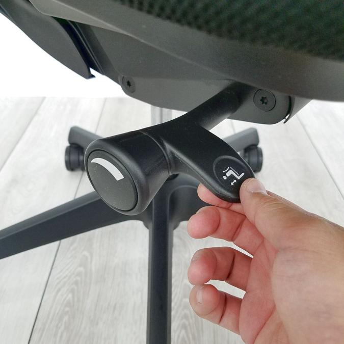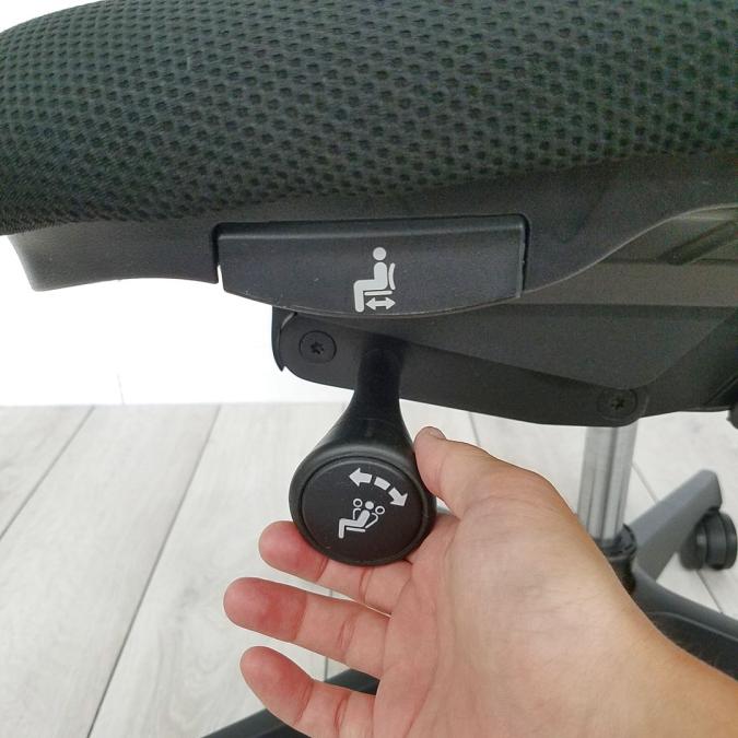 - 座面右下のダイヤル操作で、リクライニングの強弱調整が行えます。これまでのダイヤル式よりも、少ない回転数で、最弱?最強の調整が可能です。