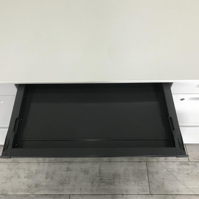 - 地震時、センター引出しが飛び出さないよう、ラッチ機構を装備。脚はデスクの横ズレを軽減させる設計になっています。
