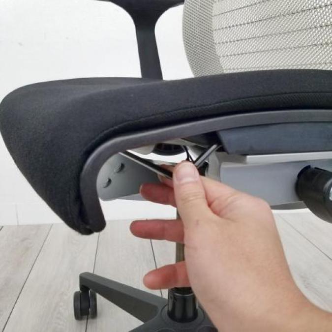 快適な座り心地に不可欠な調節機能である、上下昇降、座面の奥行き調整、リクライニングなどを備えており、操作もわかりやすく好評です。 特に、座面の奥行きは、座面下の左右に通った細いバーで調整でき、座ったままで軽やかに滑るように調整が可能です。 価格面では、新品では高めですが、中古は流通も多く、定価の3割前後の価格で高級チェアの座り心地を手に入れることができます!