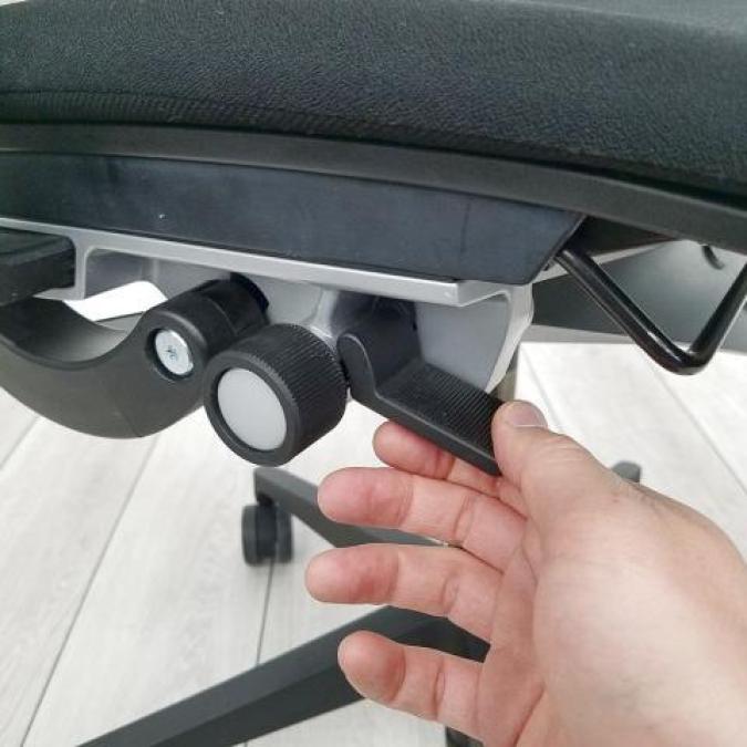 - レバーを引き上げながら座面を前後にスライドさせ、レバーを放すとロックします。背もたれに身体をつけた状態で膝の裏側と座面のエッジの間に5-8センチほどの隙間ができるのが理想的です。