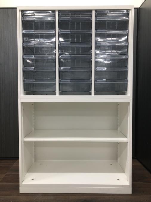 オカムラ製の珍しい商品です。オープン書庫とクリスタルトレーの組み合わせから