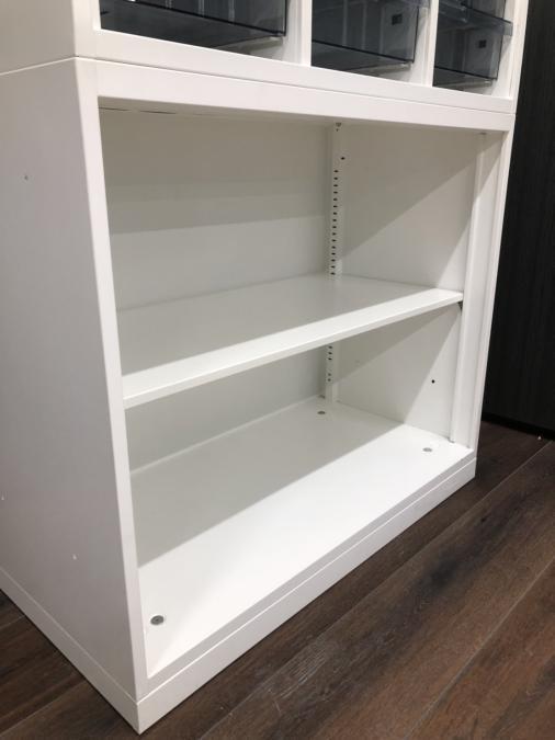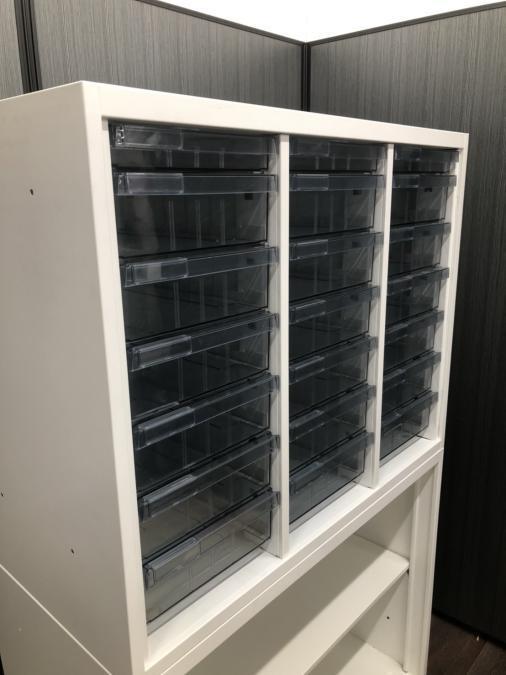 オカムラ製のレクトラインシリーズから、2段オープンキャビネットとクリスタルトレーを