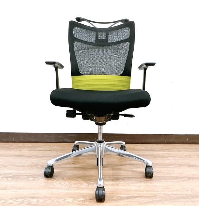 【快適な座り心地で作業効率アップ!】■オカムラ フィーゴチェア 可動肘付 シームレスタイプ ライムグリーン ハンガー付 ※肘に擦れ・削れ・欠けありのためお安く!