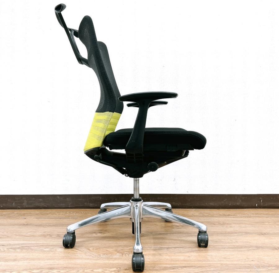 【定価約8万円】【背あてのしなやかな曲線が背中にフィット!】■オカムラ(okamura)製 フィーゴ(feego)チェア ハイバック肘付 ■可動肘/ハンガー付 ■ライムグリーン×ブラックシェル【高機能エルゴノミクスチェア】※肘パッドスレありのため特価【AD】