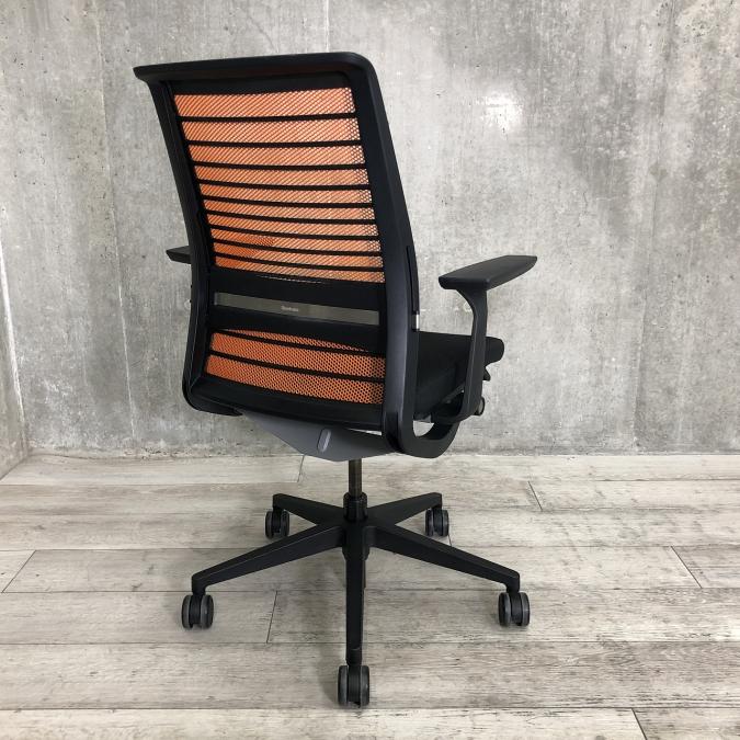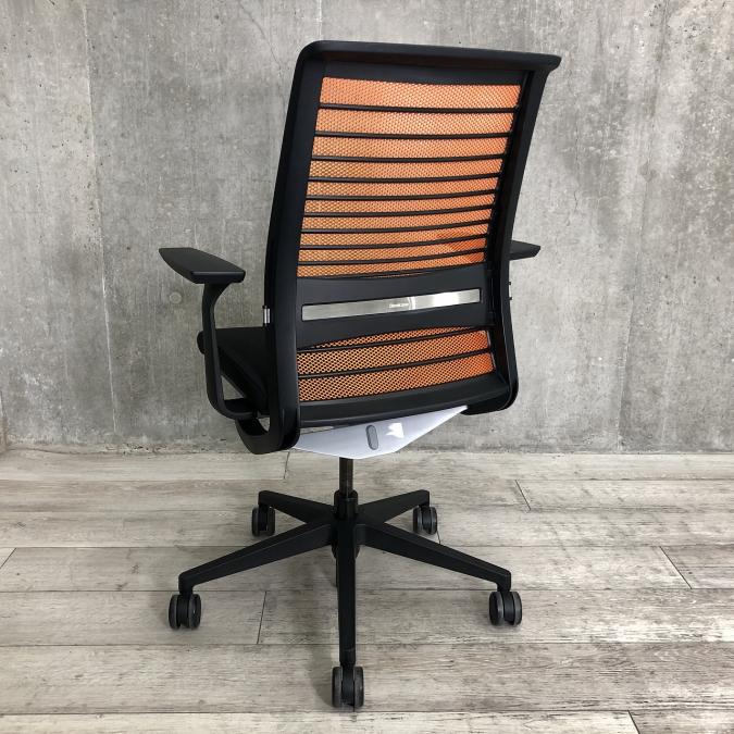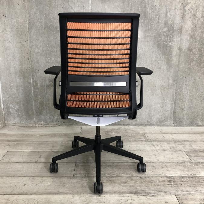 【定価約16万円】【ワイヤーが体にフィットするアメリカ発の大人気商品!長時間の着座ストレスを軽減!】 ■スチールケース(Steelcase)製 シンク(think)チェア 肘付き ハイバック ■メッシュバック ■固定肘/ランバー付 ■背面:オレンジ/座面:ブラック〈岐阜・愛知・三重・静岡・福井〉