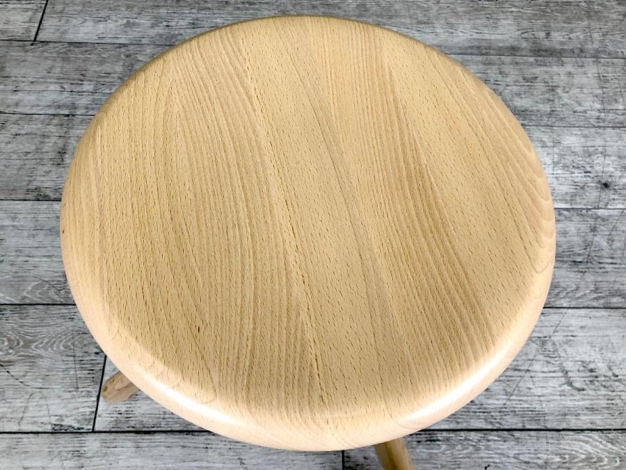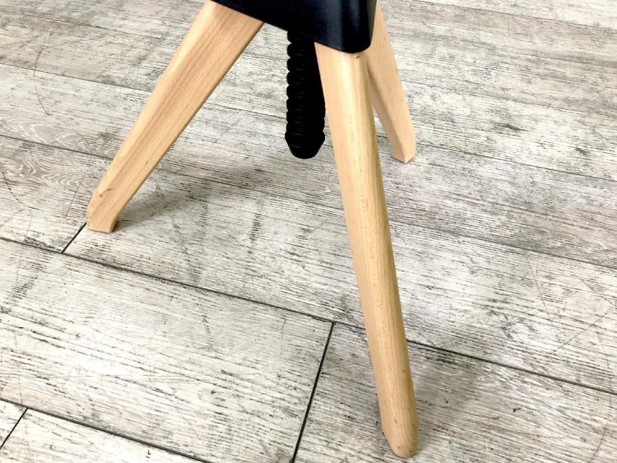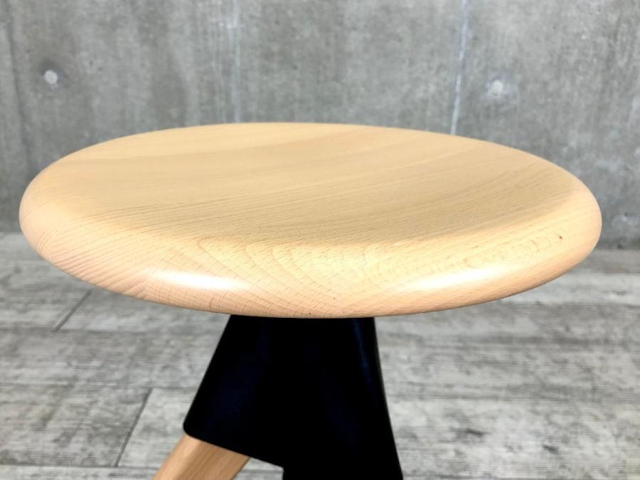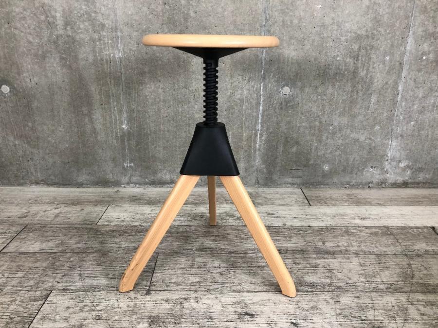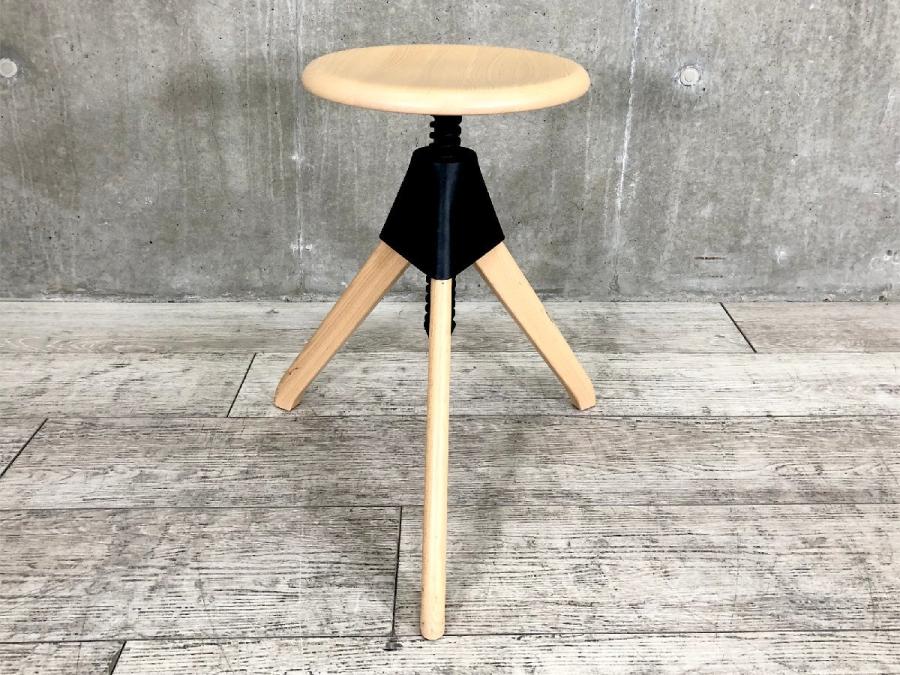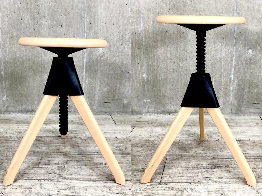 形は古典的な作業用スツールですが、機構部に使われた色鮮やかな樹脂と、木の質感との対比が斬新な印象を与えてくれます。