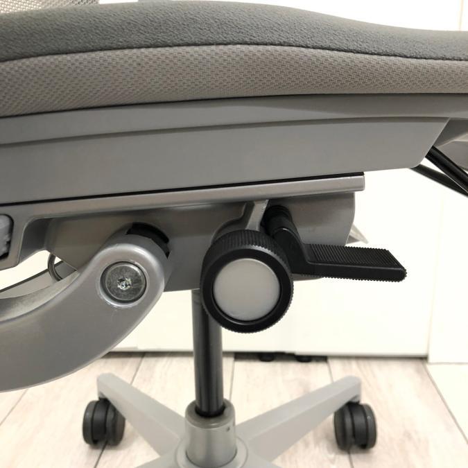 快適な座り心地に不可欠な調節機能である、上下昇降、座面の奥行き調整、リクライニングなどを備えており、操作もわかりやすく好評です。 特に、座面の奥行きは、座面下の左右に通った細いバーで調整でき、座ったままで軽やかに滑るように調整が可能です。 価格面では、新品では高めですが、中古は流通も多く、定価の3割前後の価格で高級チェアの座り心地を手に入れることができます!