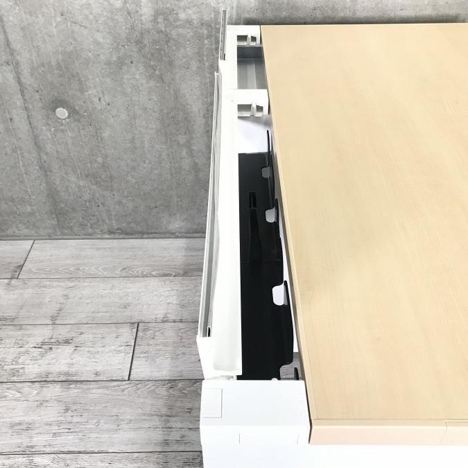 - 地震時、センター引出しが飛び出さないよう、ラッチ機構を装備。脚はデスクの横ズレを軽減させる設計になっています。