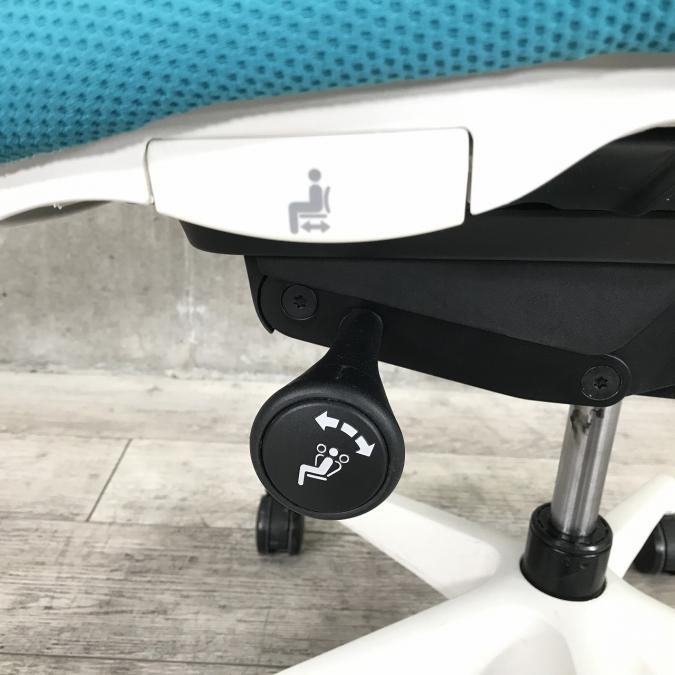 - 座面左下のダイヤルでリクライニングの固定と解除が行えます。 前傾ポジションをとることも可能です。