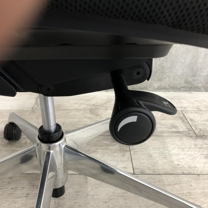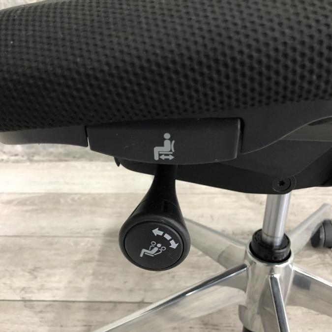 - 座面右下のダイヤル操作で、リクライニングの強弱調整が行えます。これまでのダイヤル式よりも、少ない回転数で、最弱?最強の調整が可能です。