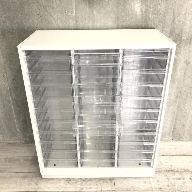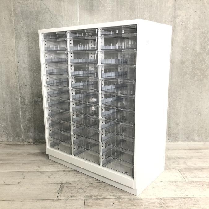 【書類・備品整理の必需品!】【珍しいクリトレが入荷!3列×浅型11段+深型5段】■イトーキ(ITOKI)製 シンラインシリーズ クリスタルトレー ローキャビネット ■3列×浅型11段+深型5段 ■天板・ベース付 ■色:ホワイト
