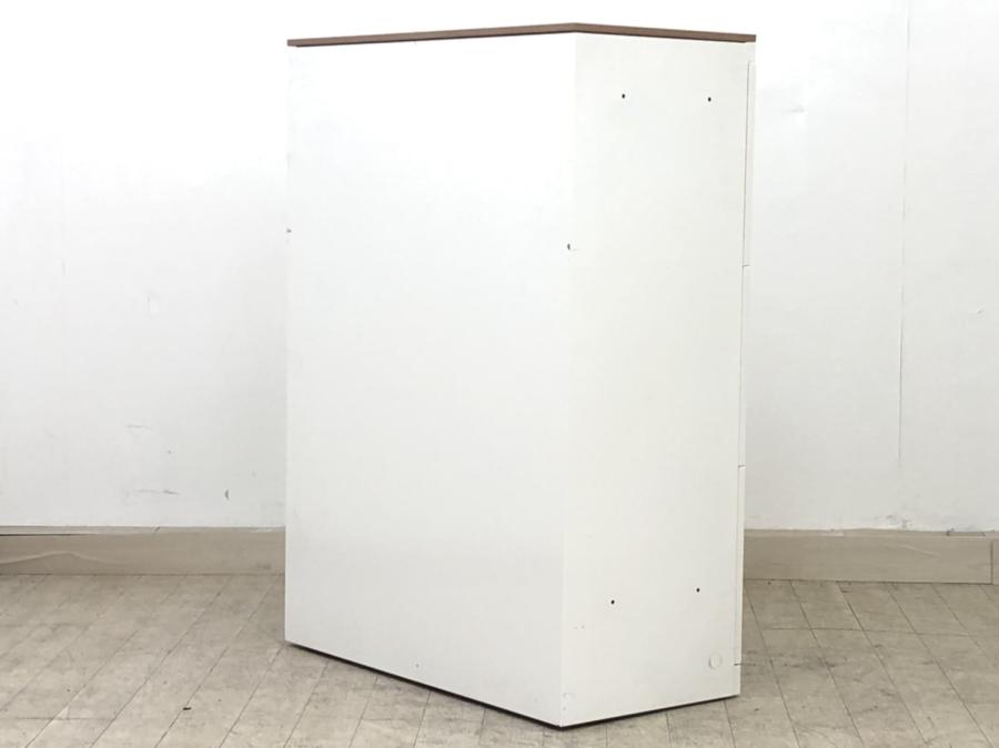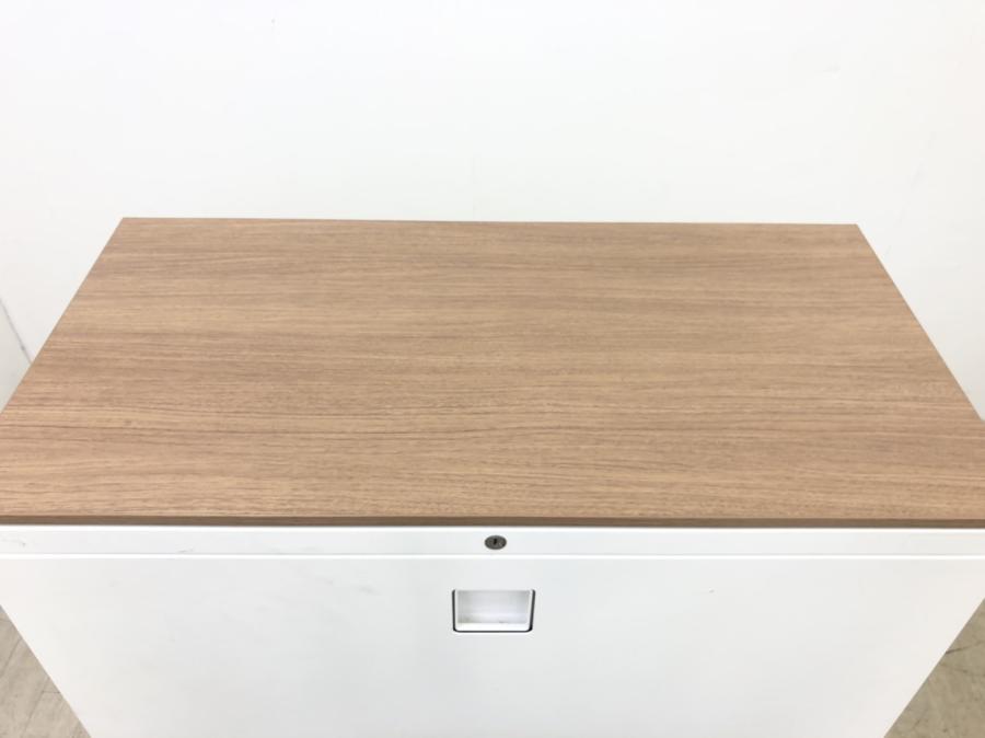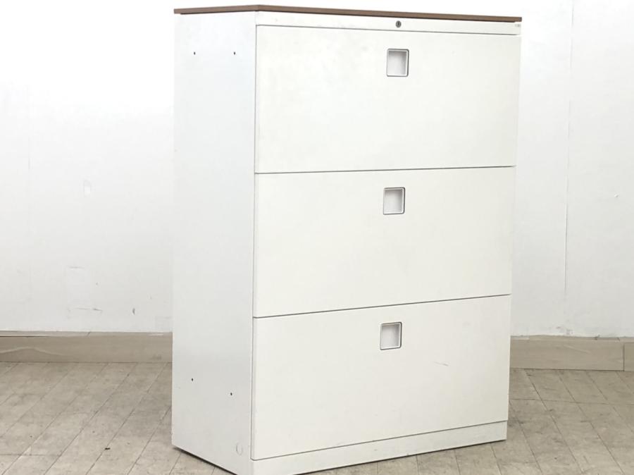 オカムラ レクトライン 3段ラテラル書庫 ホワイト天板 シリンダー錠 鍵付き ※取っ手部分に若干日焼けあり