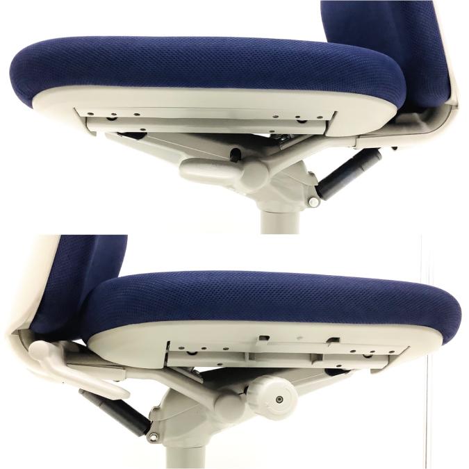 もう一つは、オカムラ社独自の""異硬度クッション""が座面に採用されていることです。これは座面が位置により異なる硬さのウレタンでできており、前方は腿裏を圧迫しないようソフトに、後方はしっかりと体重を支えるために少し硬めに作られています。クッション性とホールド感の両立により、長時間の作業での疲れを軽減してくれます。"