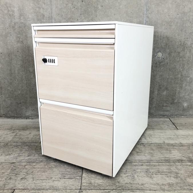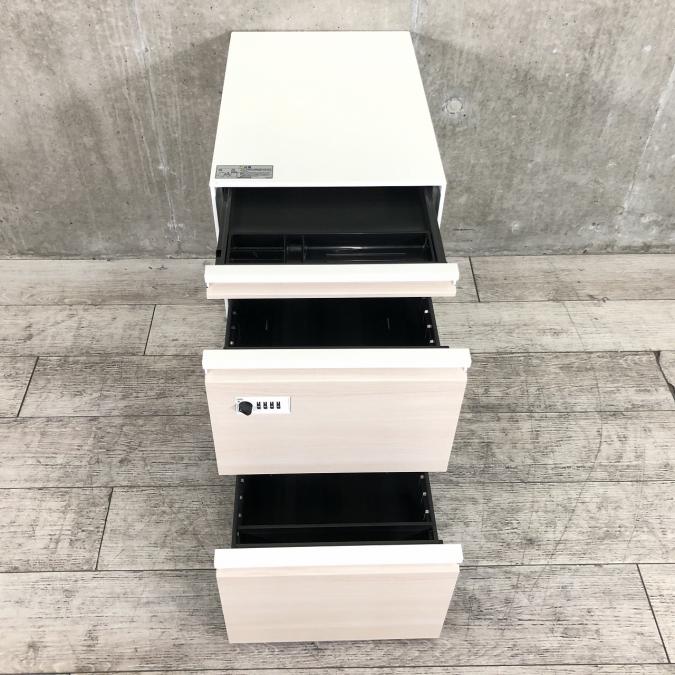【珍しい木目のワゴン入荷!】オカムラ(okamura)プロステージクレストシリーズ 3段ワゴン ■色:本体/ホワイト 正面/ナチュラル ダイヤル錠タイプ- 千葉店