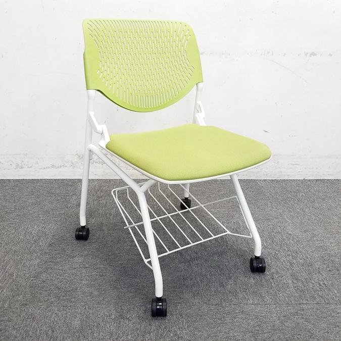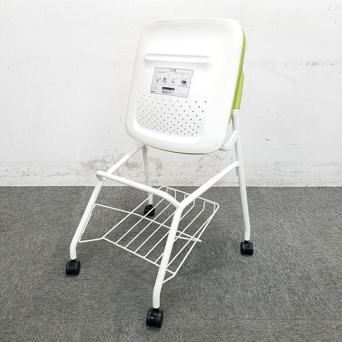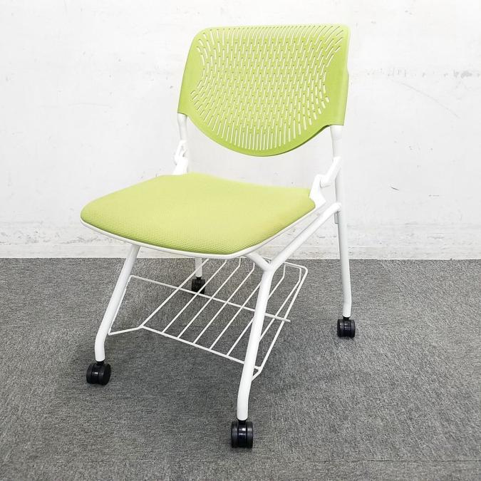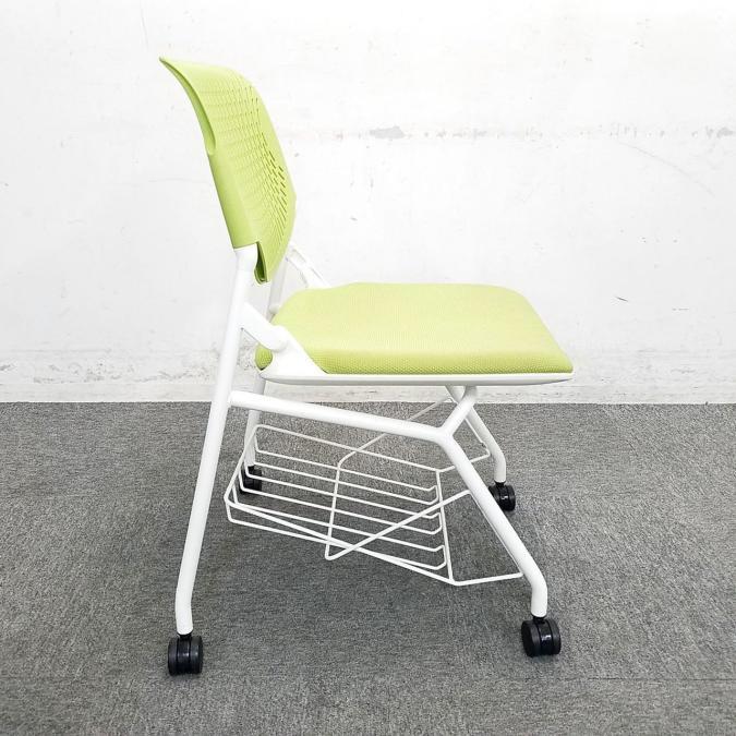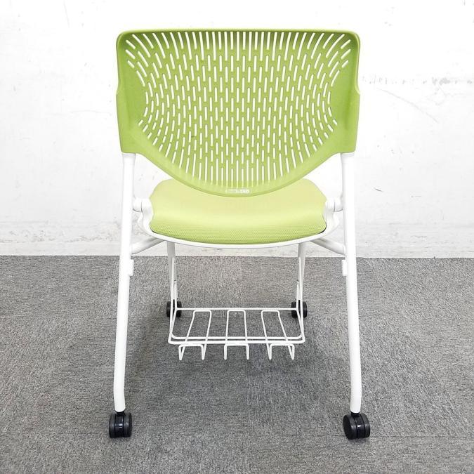 【4脚セット】オカムラ製 ルナシリーズ グリーンカラー 珍しい荷物カゴ付き ネスティングチェア!!- 京都東寺店