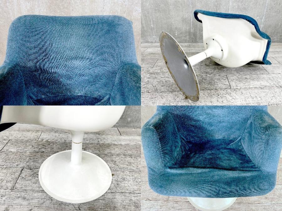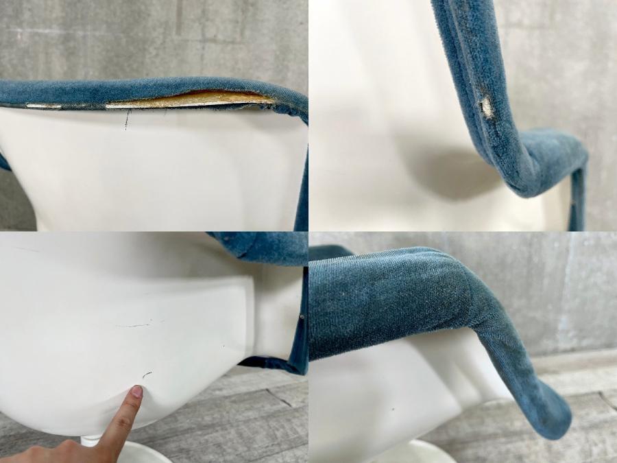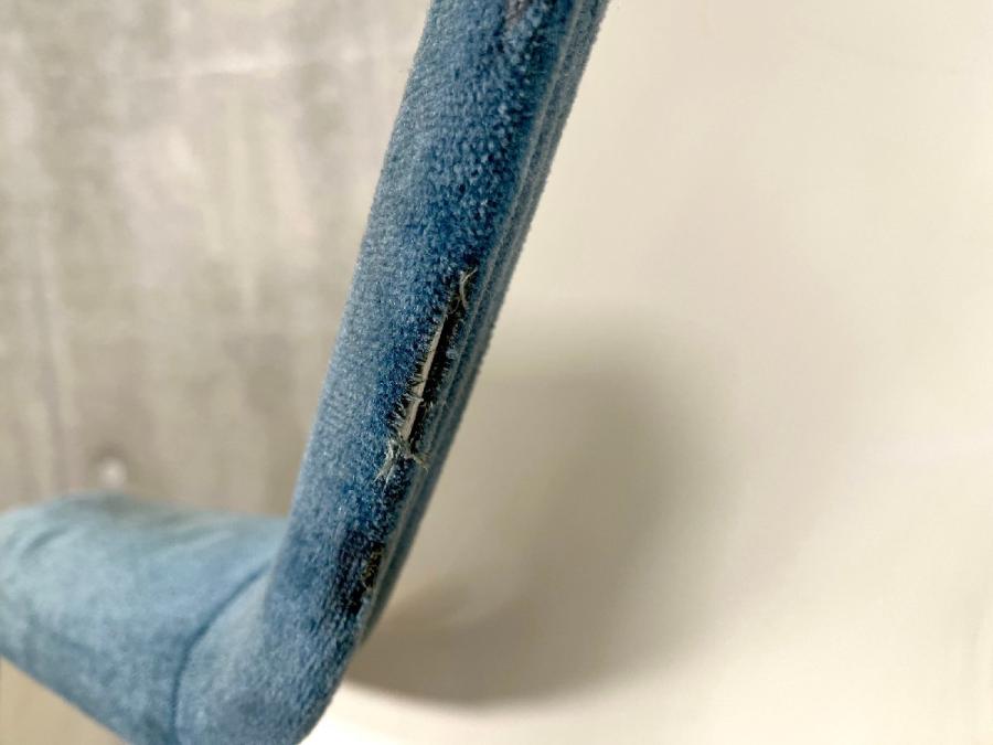 人間工学に基づき体のラインに合わせて成型されたフォルムは美しく座り心地にも安定感のあるものです。グラスファイバーで造られた座面の上にブルーのファブリックを貼った仕様になっておりますので、異素材の組み合わせを楽しみながらもソフトな当たりで快適なすわり心地です。