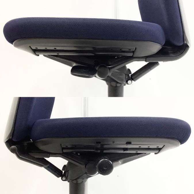もう一つは、オカムラ社独自の""異硬度クッション""が座面に採用されていることです。これは座面が位置により異なる硬さのウレタンでできており、前方は腿裏を圧迫しないようソフトに、後方はしっかりと体重を支えるために少し硬めに作られています。クッション性とホールド感の両立により、長時間の作業での疲れを軽減してくれます。"