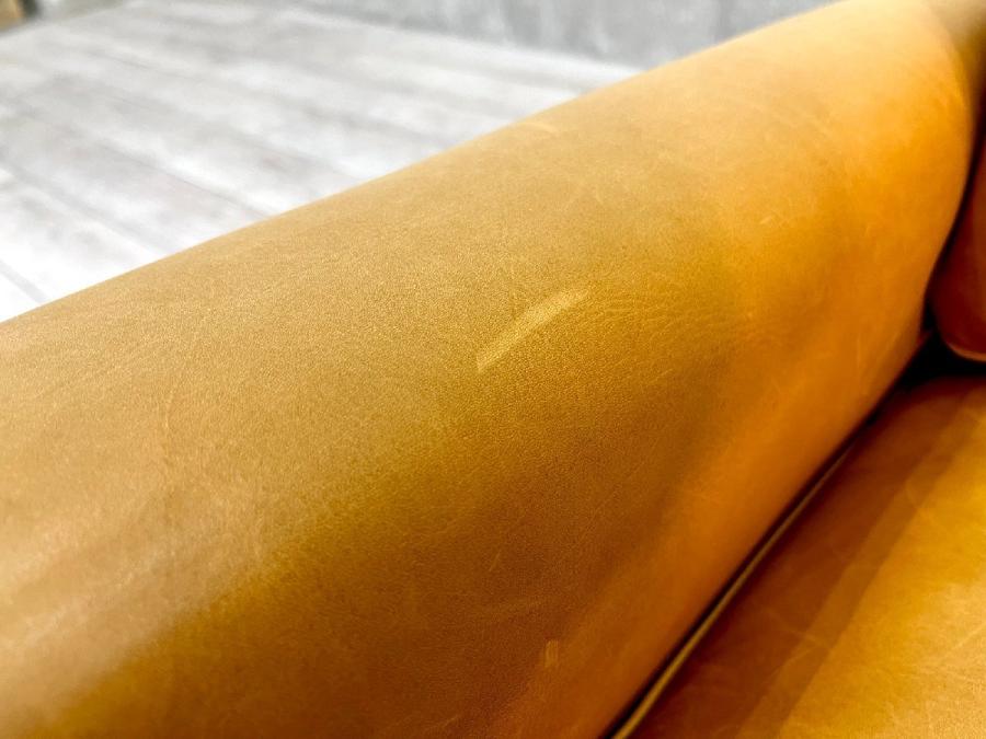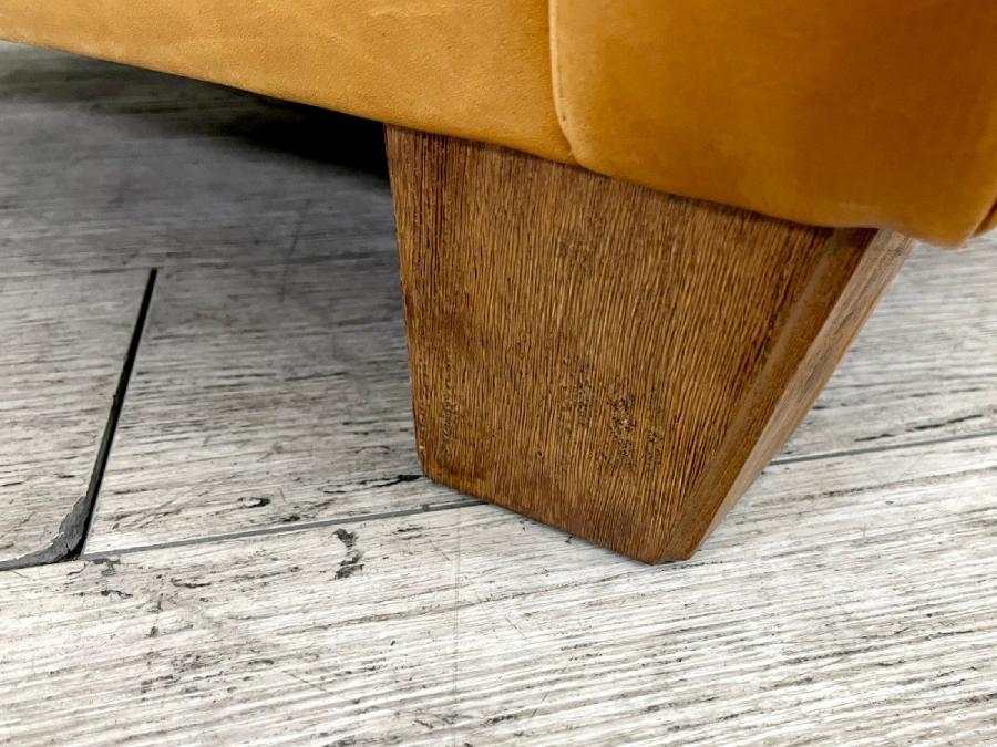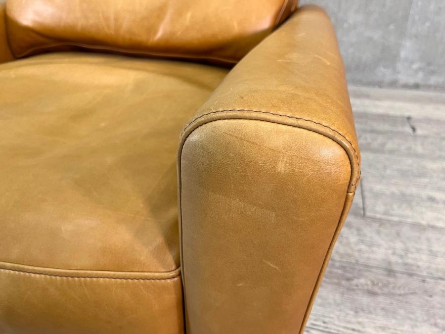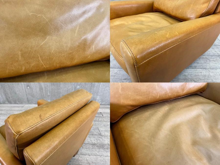 表面の表情豊かなオイルレザーは、カウハイドレザーを使用。フレーム内のシート下にはSバネを採用し、その上に、「チップウレタン」「ラバーウレタン」「フェザー」と素材・硬さの違う3層を重ねた構造のクッション材がおかれています。