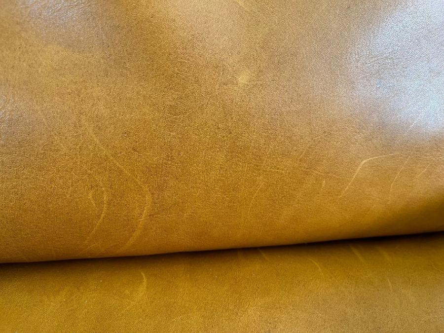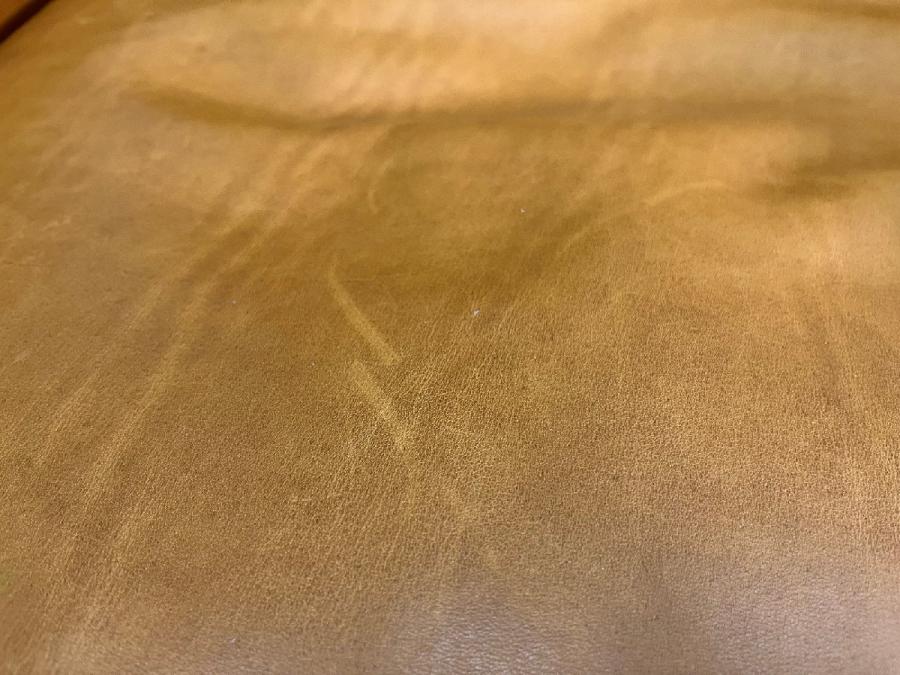 表面の表情豊かなオイルレザーは、カウハイドレザーを使用。フレーム内のシート下にはSバネを採用し、その上に、「チップウレタン」「ラバーウレタン」「フェザー」と素材・硬さの違う3層を重ねた構造のクッション材がおかれています。