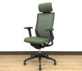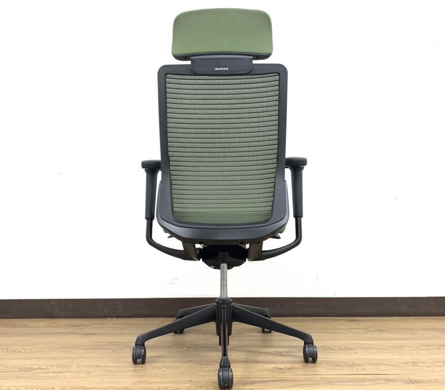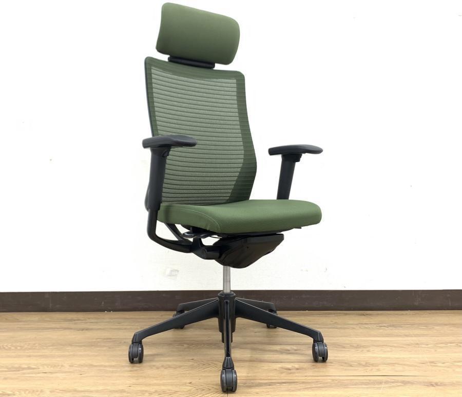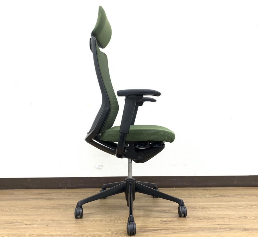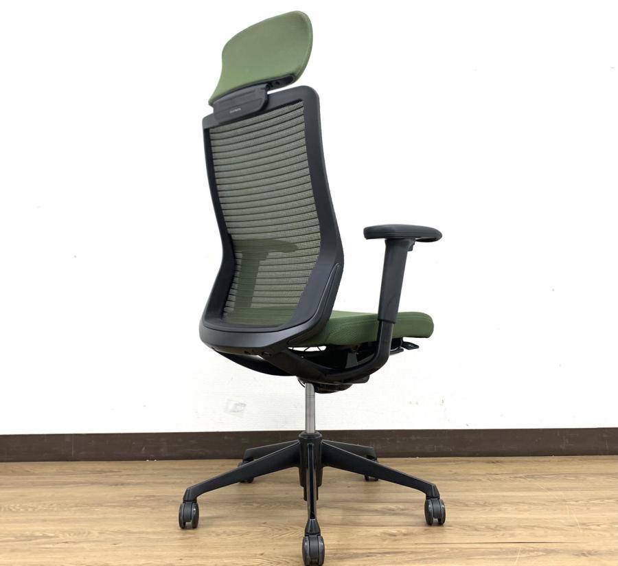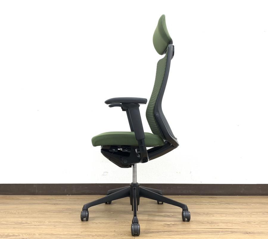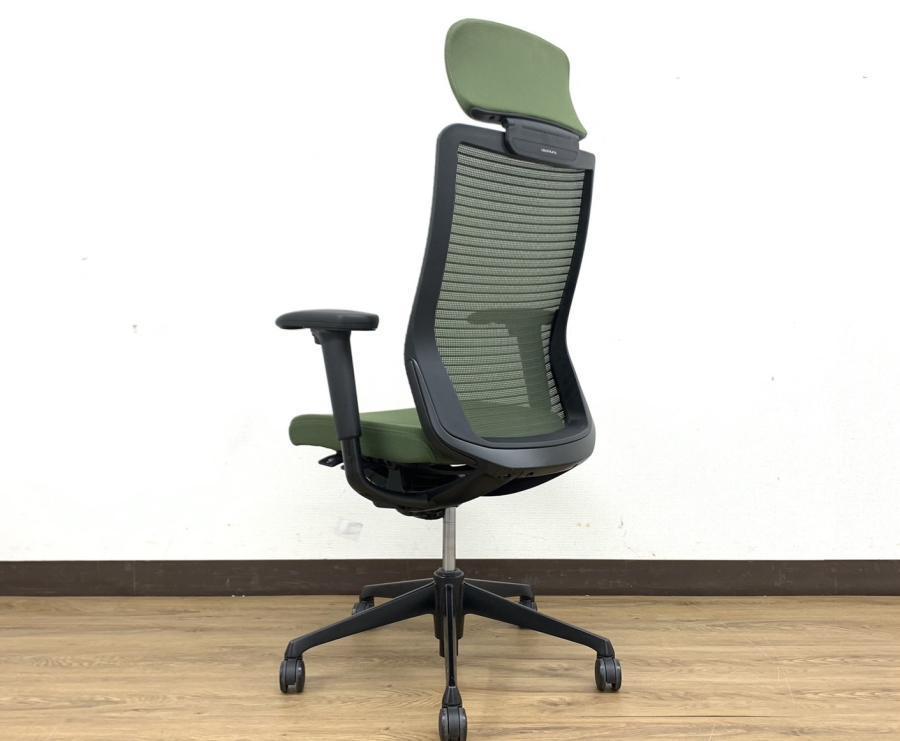 【ヘッドレスト付き!】◆オカムラ製 コーラルチェア 可動肘付 ダークグリーン【美しいデザインの快適メッシュ!】- 川崎店
