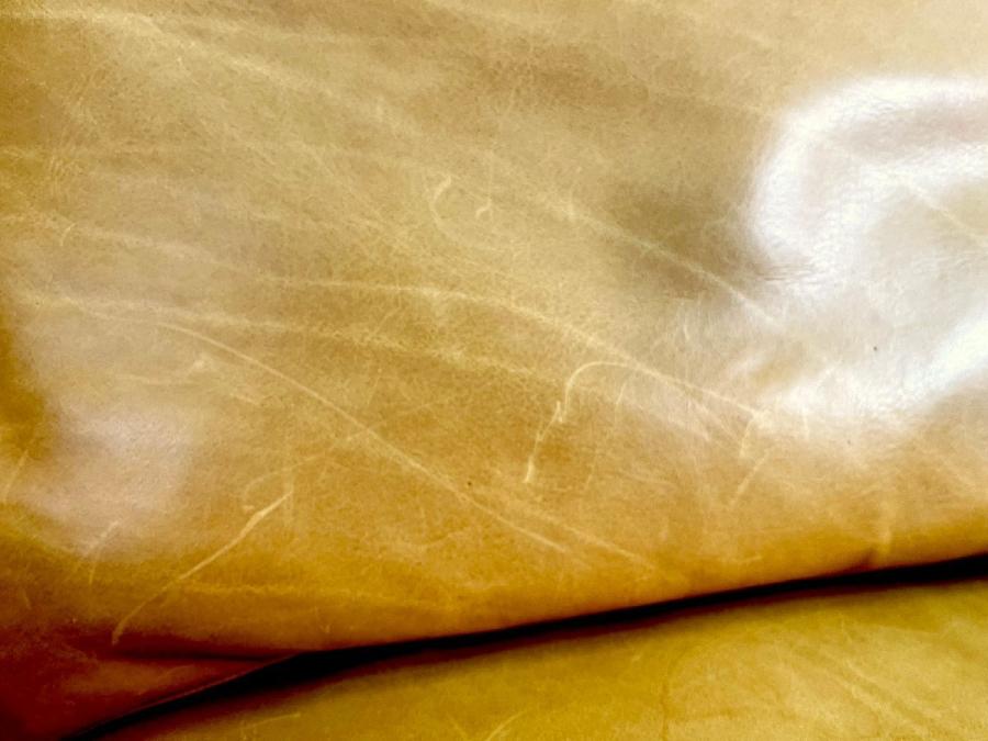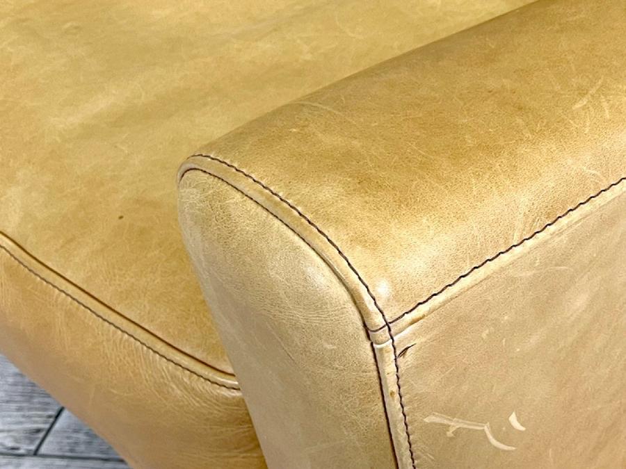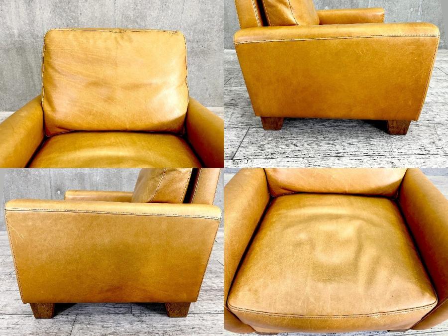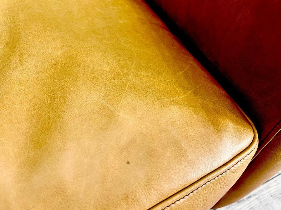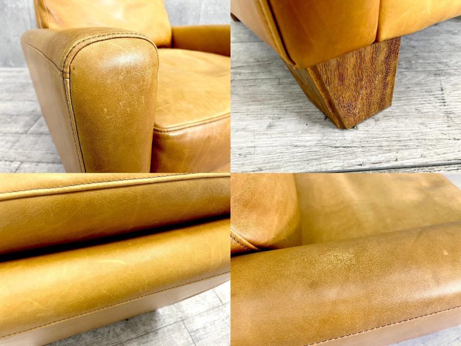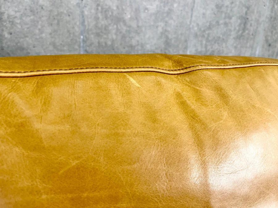 表面の表情豊かなオイルレザーは、カウハイドレザーを使用。フレーム内のシート下にはSバネを採用し、その上に、「チップウレタン」「ラバーウレタン」「フェザー」と素材・硬さの違う3層を重ねた構造のクッション材がおかれています。
