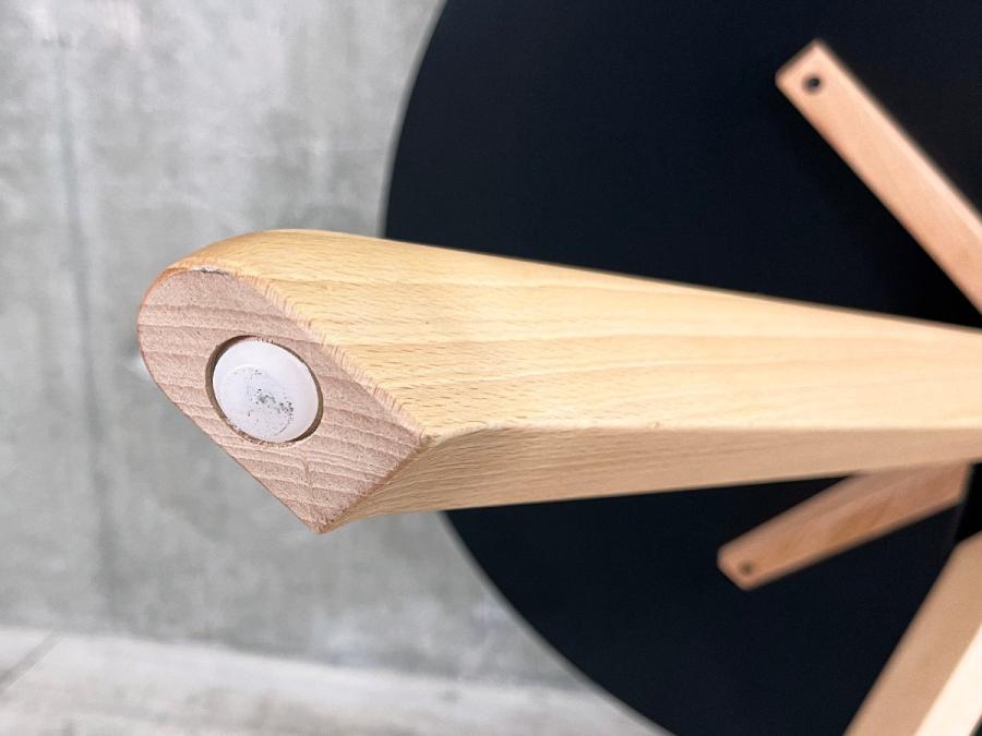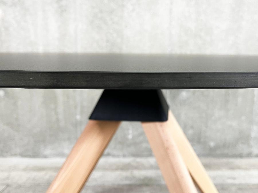 薄めの天板や脚部の開きなど、美しく計算されたデザインです。天板と脚部をつなぐジョイント部は天板と同色に塗装され、程良いアクセントに。ダイニングテーブルとしてだけではなく、オフィスの作業用テーブルとしても活躍してくれます。
