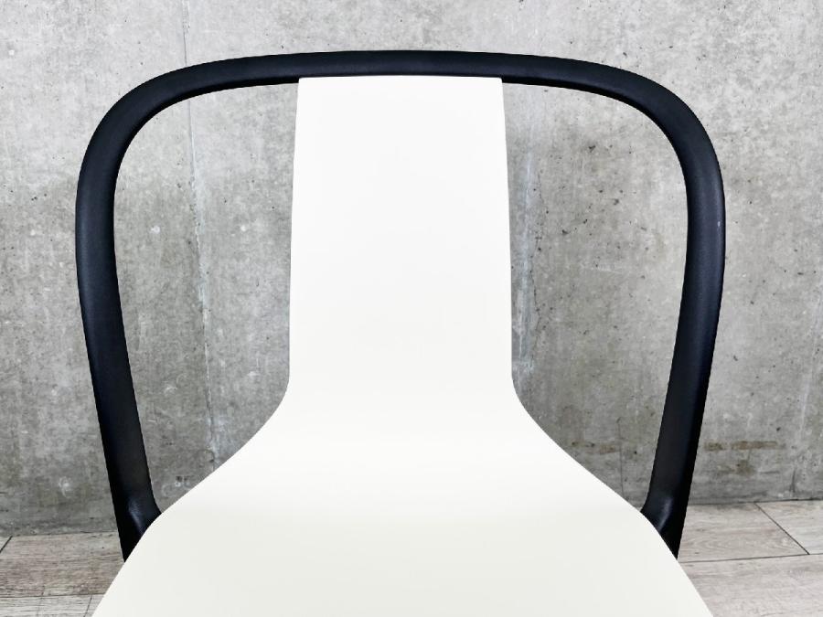この椅子の最大の特徴はシートシェルです。シートシェルは、ベルヴィルチェアのアイデンティティとなる部分であり、素材や色に応じてイメージが変化します。スレンダーな黒のフレームは、脚や背面に向かって書道の線を思わせるようなラインを描いています。一方シートシェルは、広めの座面が背もたれにかけて細くなっていき、非常に薄いシェルを支えています。