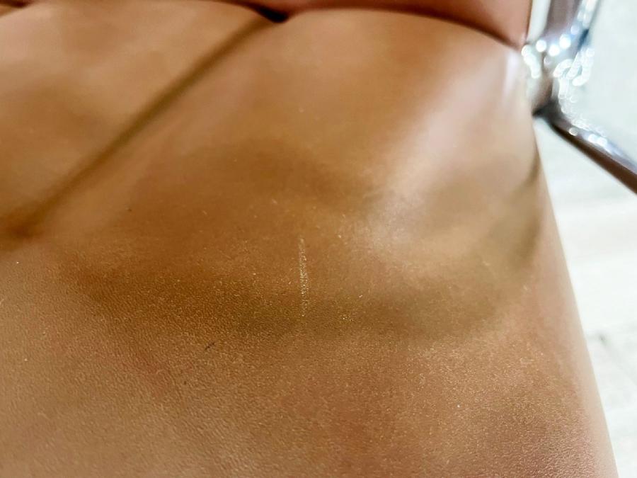 - あり黄ばみ・変色が広い範囲にうっすらある、または濃い黄ばみ・変色が一部ある。(例、座面・背もたれ、脚部等にある。)