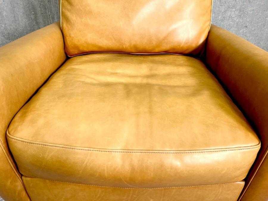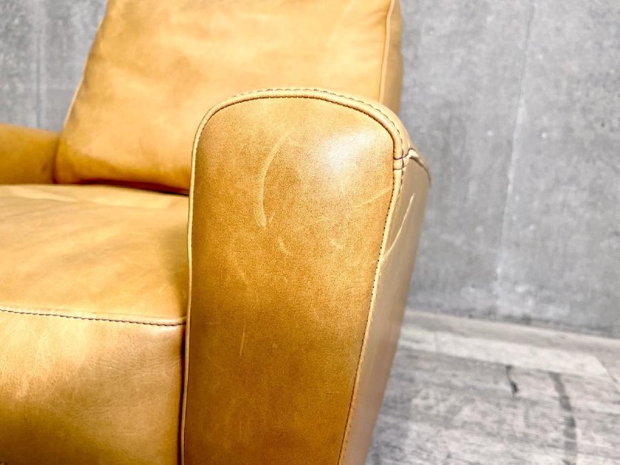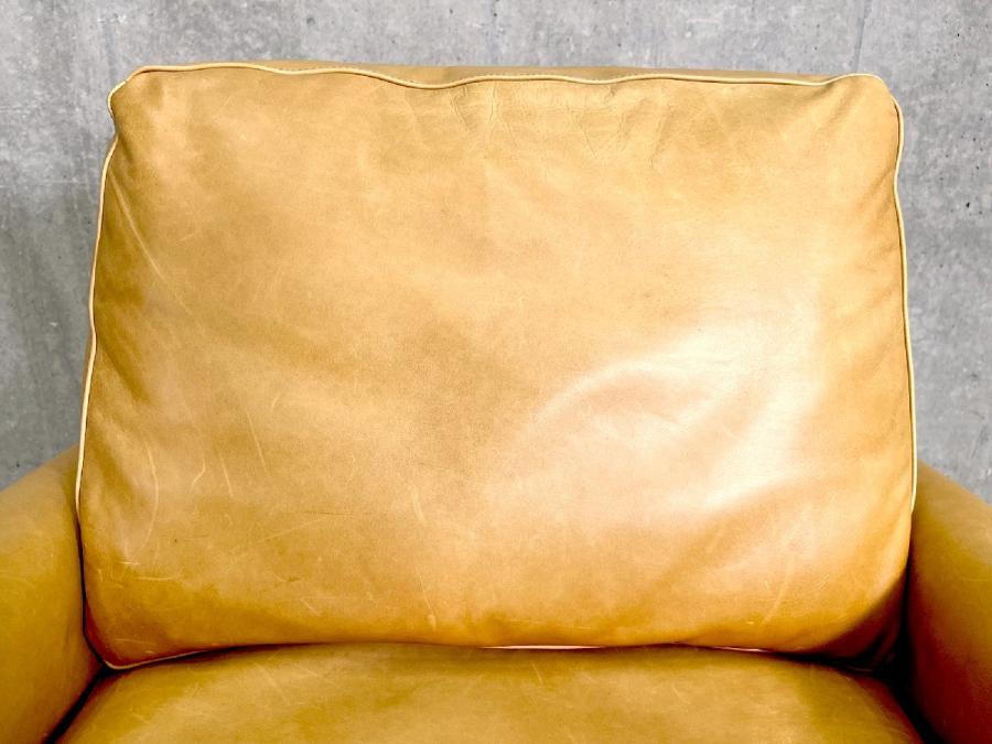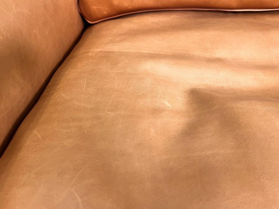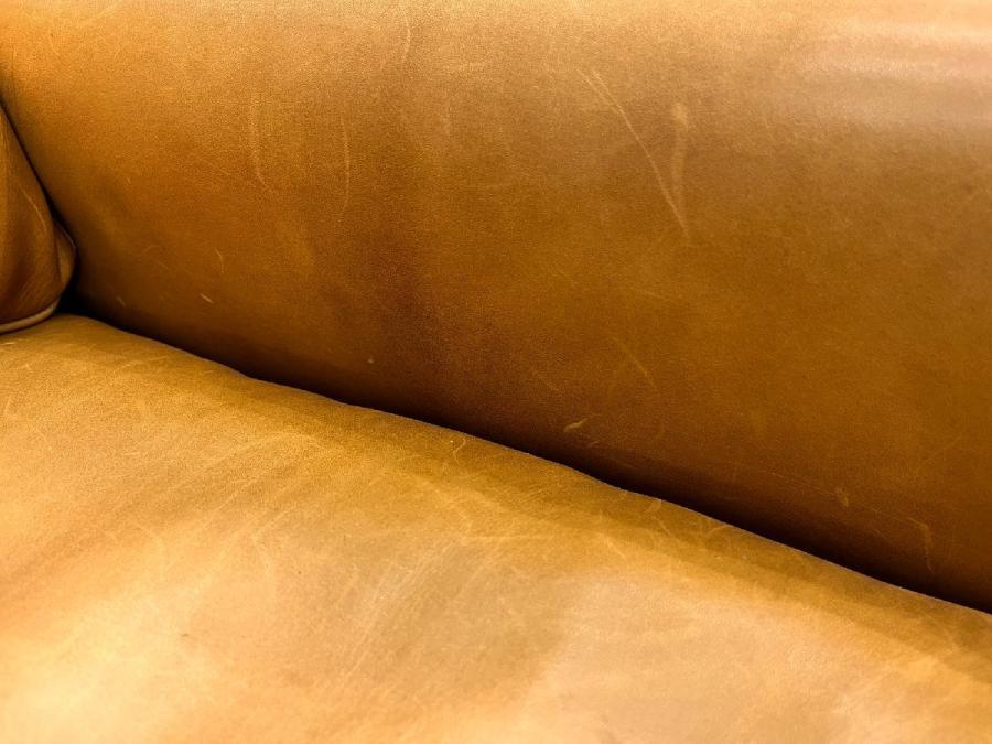 表面の表情豊かなオイルレザーは、カウハイドレザーを使用。フレーム内のシート下にはSバネを採用し、その上に、「チップウレタン」「ラバーウレタン」「フェザー」と素材・硬さの違う3層を重ねた構造のクッション材がおかれています。