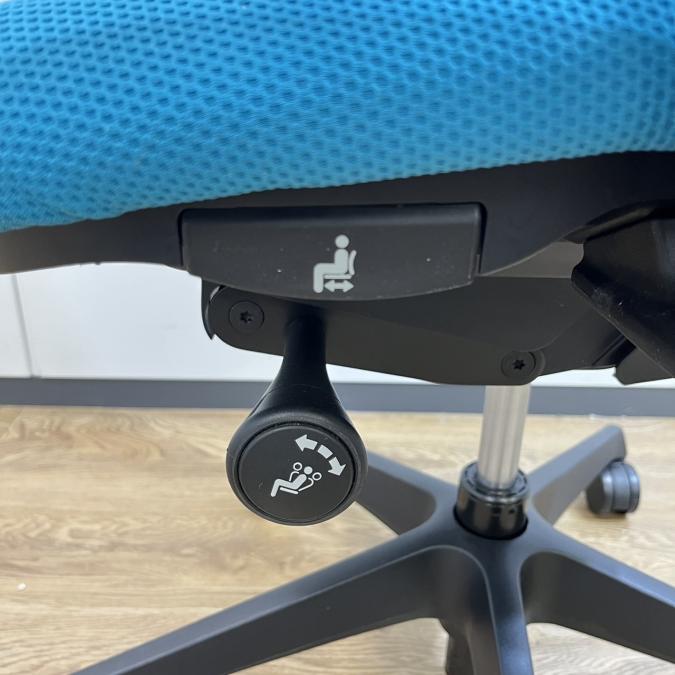 - 座面左下のダイヤルでリクライニングの固定と解除が行えます。 前傾ポジションをとることも可能です。