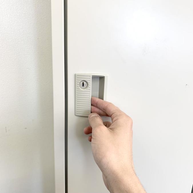 棚板付きで小物や下靴などは分けて収納可能、鍵はシリンダー錠で防犯対策もばっちり!
