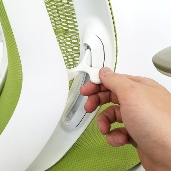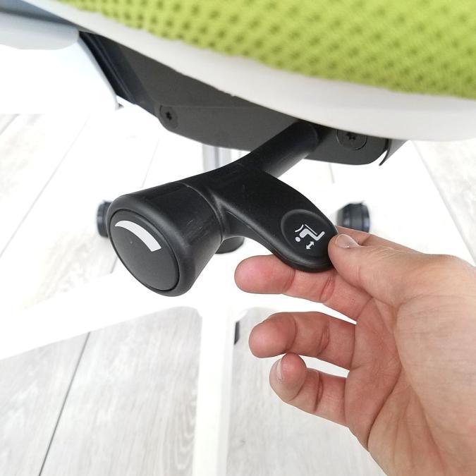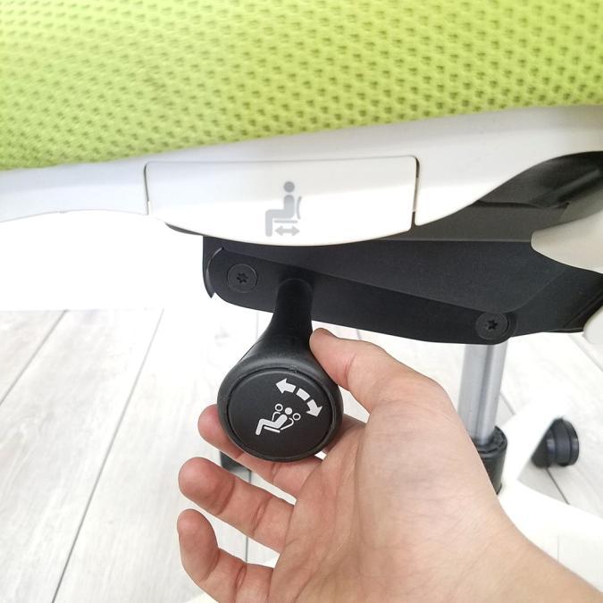 - 座面右下のダイヤル操作で、リクライニングの強弱調整が行えます。これまでのダイヤル式よりも、少ない回転数で、最弱?最強の調整が可能です。