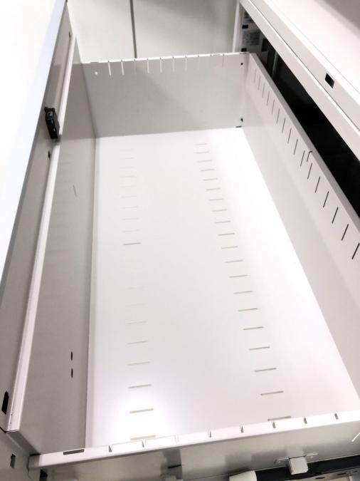 下置きは3段ラテラルキャビネット引出し型で重たいキングファイルのB4・A4などの収納に優れています。