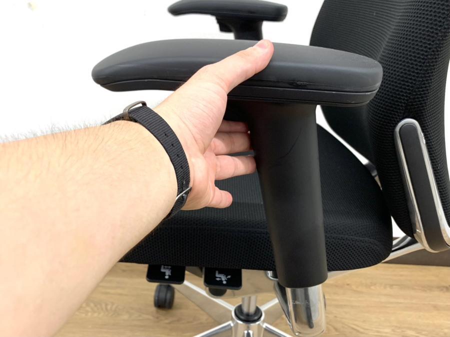 肘掛けも可動タイプとなっており、上下と左右に動作しますから、お客様のちょうど良いポジションに調節可能です。