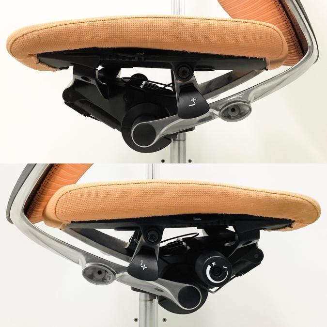 もちろん座り心地もコンテッサの直系ですから快適です。座面の素材はクッションとメッシュの2タイプあります。私、個人的には座面の中心部分でも外側でもテンションが変わらないクッション素材が、足を閉じても開いても快適なので推しです!"