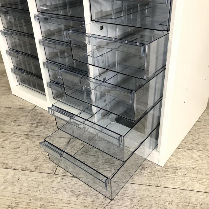【書類・備品整理の必需品!書類や備品のストックにピッタリ!※1段目のみ浅型仕様】オカムラ レクトライン クリスタルトレー 書類 引き出し 透明 ケース ローキャビネット 整理 中古家具 オフィス家具 福岡 九州最大級《オフィスバスターズ福岡博多店は、福岡を拠点として、日本全国へ中古オフィス用品・オフィス家具を提供しております》