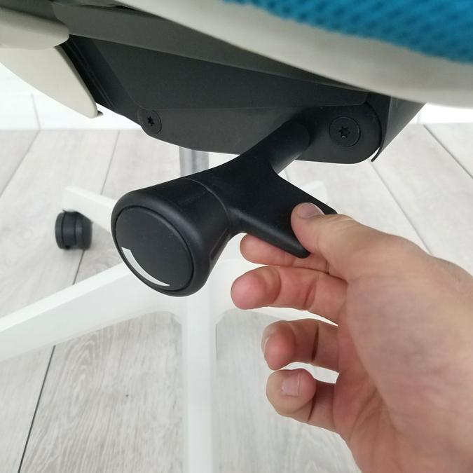 - 座面右下のダイヤル操作で、リクライニングの強弱調整が行えます。これまでのダイヤル式よりも、少ない回転数で、最弱?最強の調整が可能です。