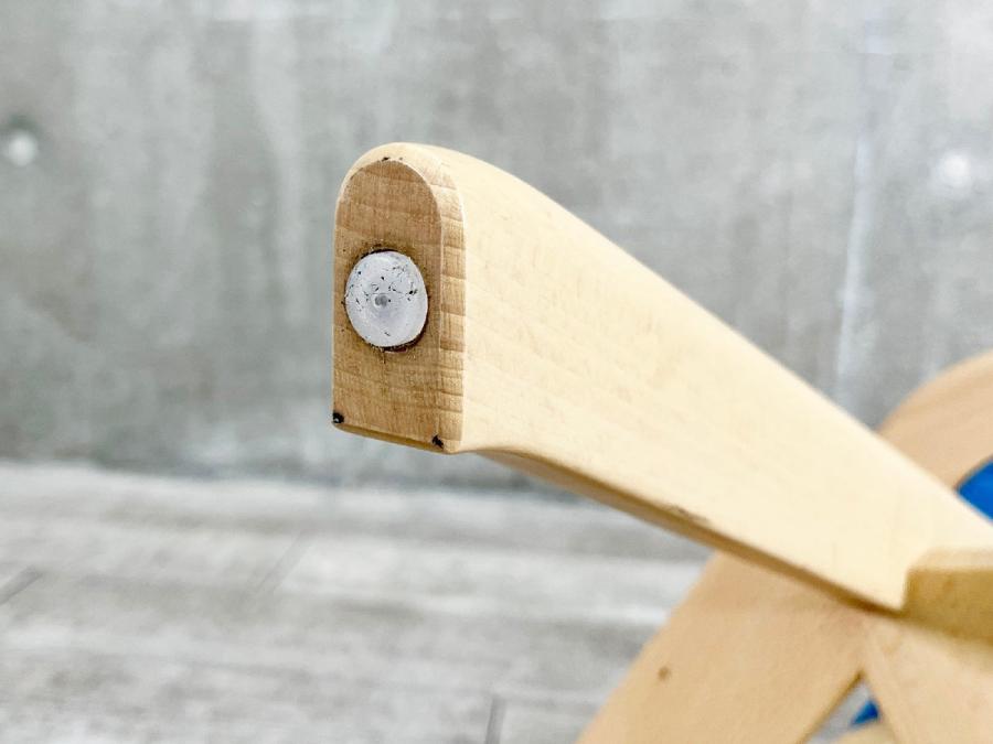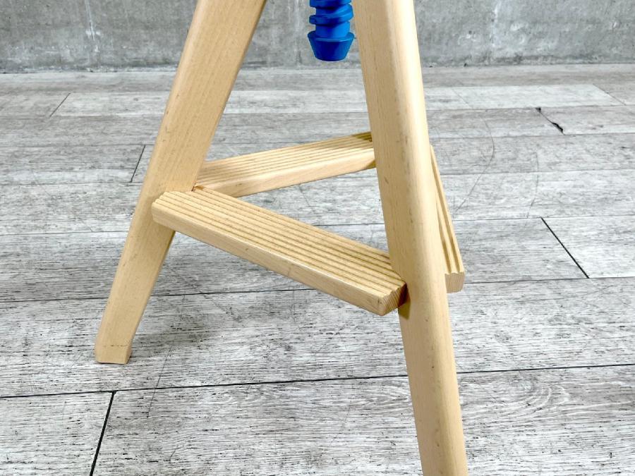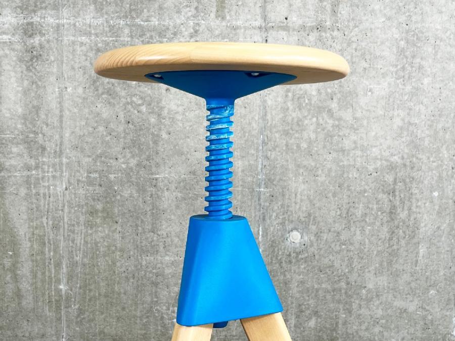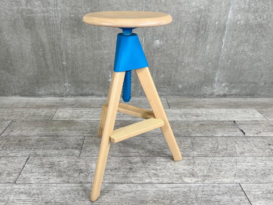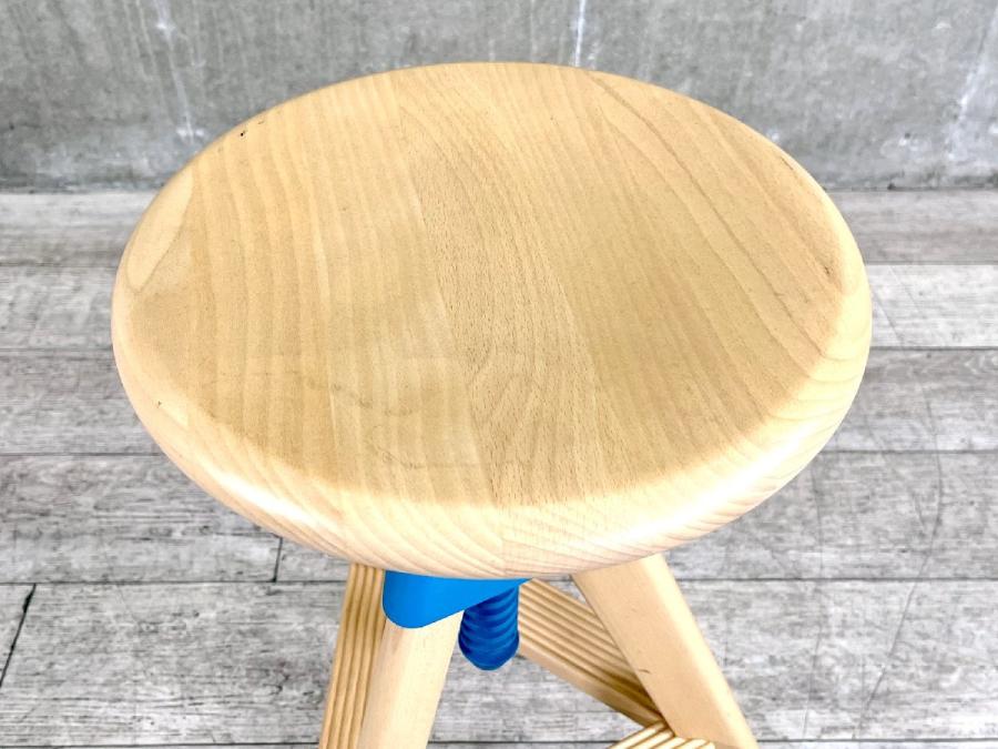 形は古典的な作業用スツールですが、機構部に使われた色鮮やかな樹脂と、木の質感との対比が斬新な印象を与えてくれます。