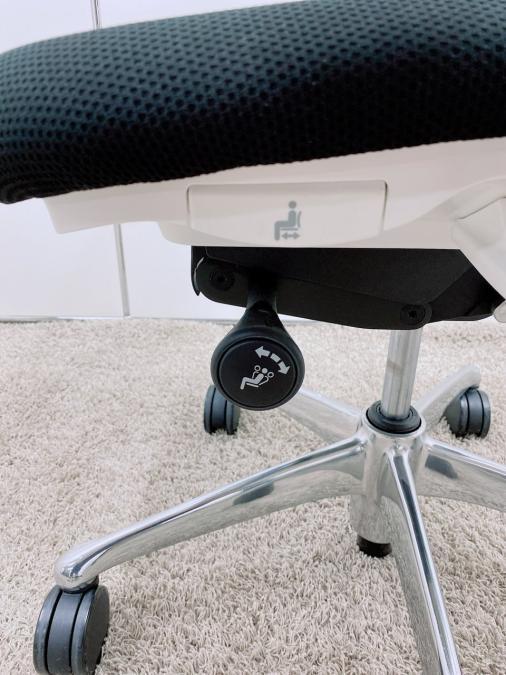 - 座面右下のレバーをスライドさせる「クイックスライドオペレーション」で、リクライニング反力を調整できます。強さの状態が視覚的にわかるため、直感的に操作がおこなえます。