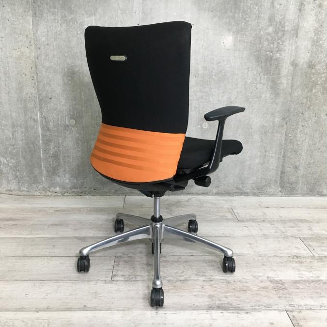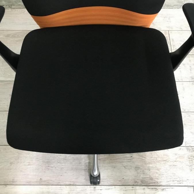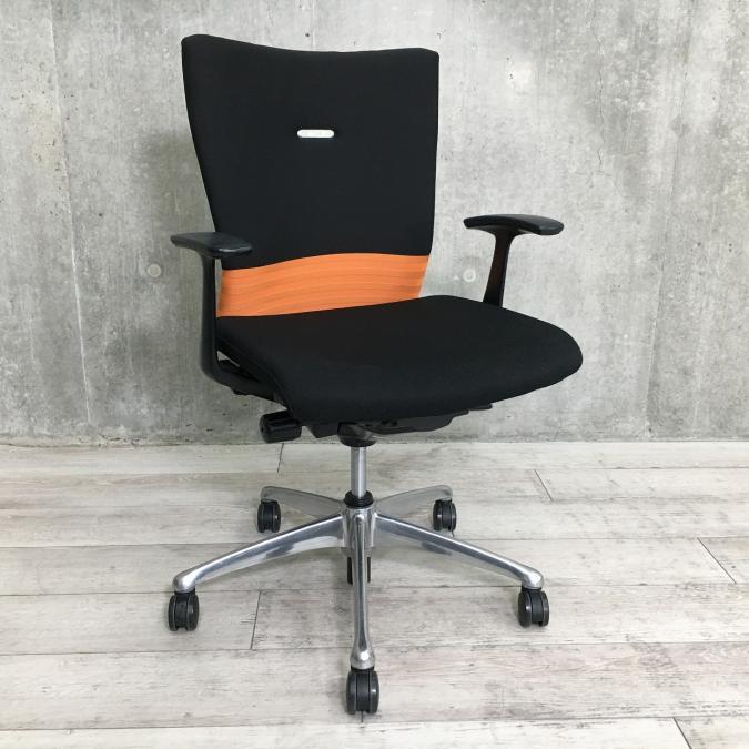 【人間工学に基づいた快適な座り心地!背あてのしなやかな曲線が背中にフィット!】■オカムラ製 フィーゴチェア (feego) 肘付きミドルバック シームレスタイプ ■固定肘 ■ブラック×オレンジ ※コートハンガー外し跡のある商品となります。【入替セールにつき30%OFF!】