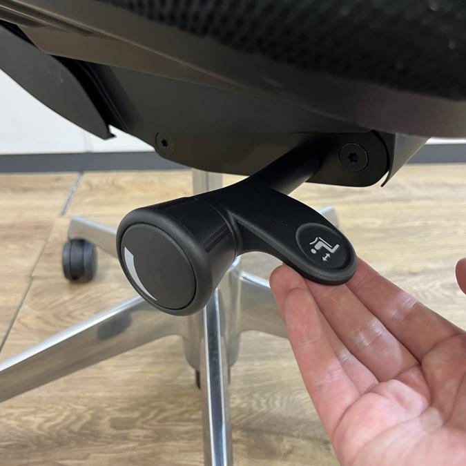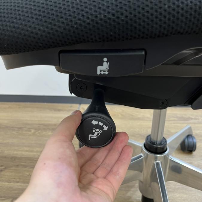 - 座面右下のダイヤル操作で、リクライニングの強弱調整が行えます。これまでのダイヤル式よりも、少ない回転数で、最弱?最強の調整が可能です。