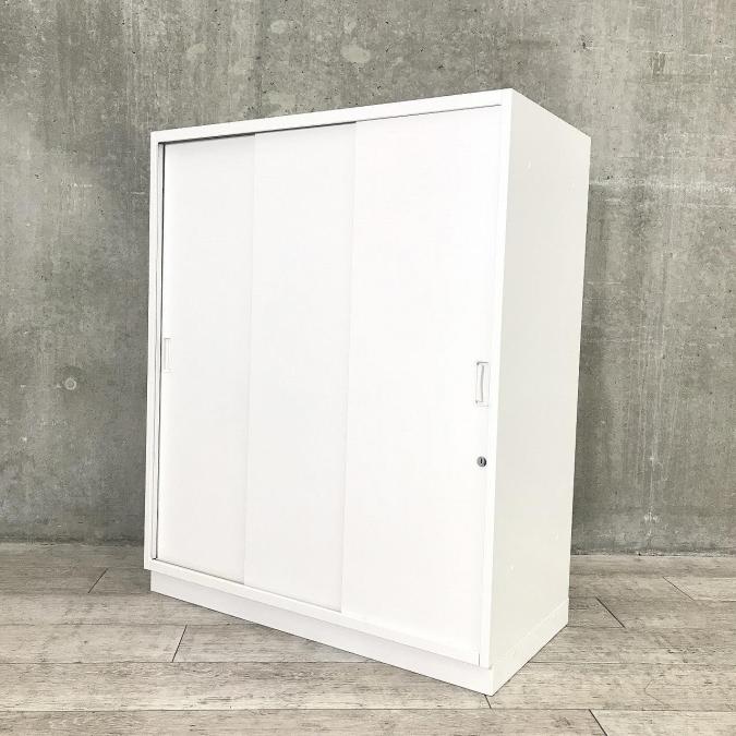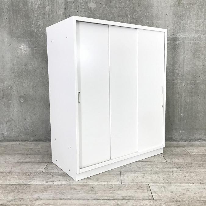 【スライド式なので開閉スペースに困りません!人気の3枚引き戸書庫!】■イトーキ (ITOKI)製 シンラインシリーズ 引き違い書庫 ローキャビネット 3枚引き戸 H1120㎜ ■天板付 ■ホワイト ■シリンダー錠