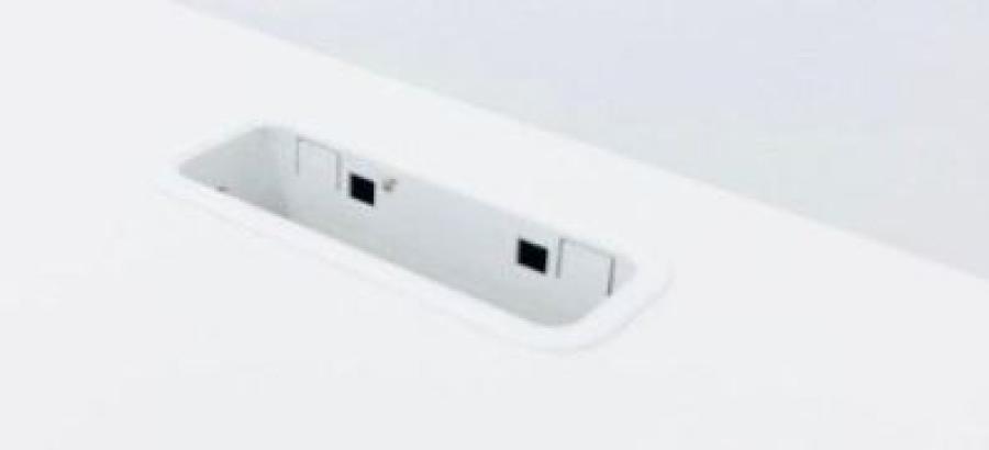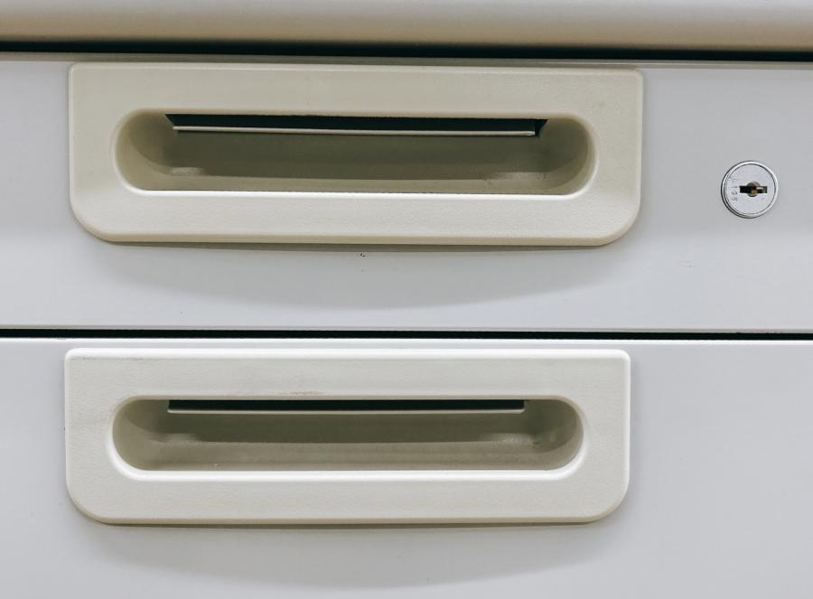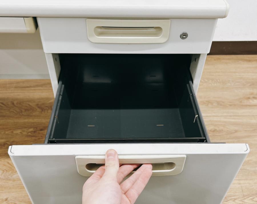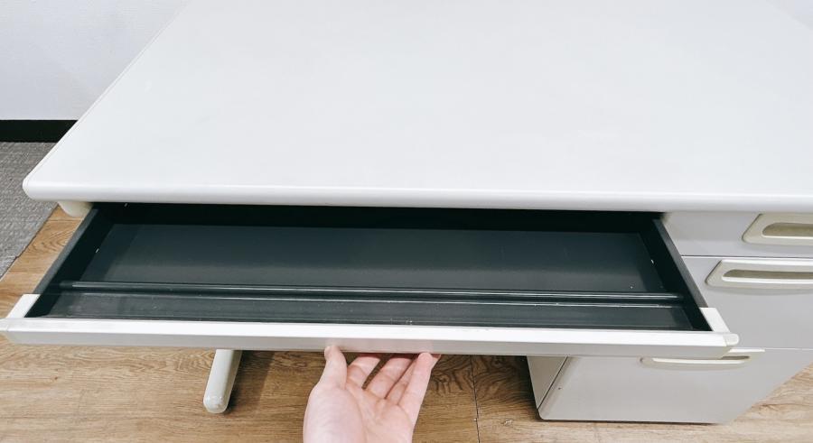 通常のデスクと同じく配線口付き、右三段の引き出しも付いております!※配線カバー欠品しています。