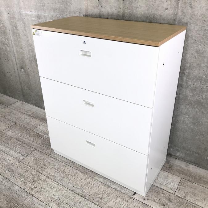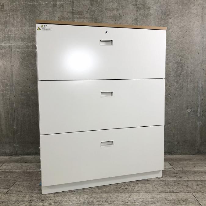 【人気3段ラテラルの小さめサイズ!天板付きのローキャビネット!】■イトーキ(ITOKI)製 シンライン(THIN LIN)シリーズ 3段ラテラル書庫 ローキャビネット ■天板付き ■ホワイト ■シリンダー錠 ※ラッチ日焼け有【AD】
